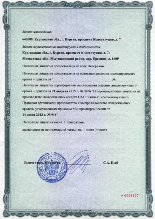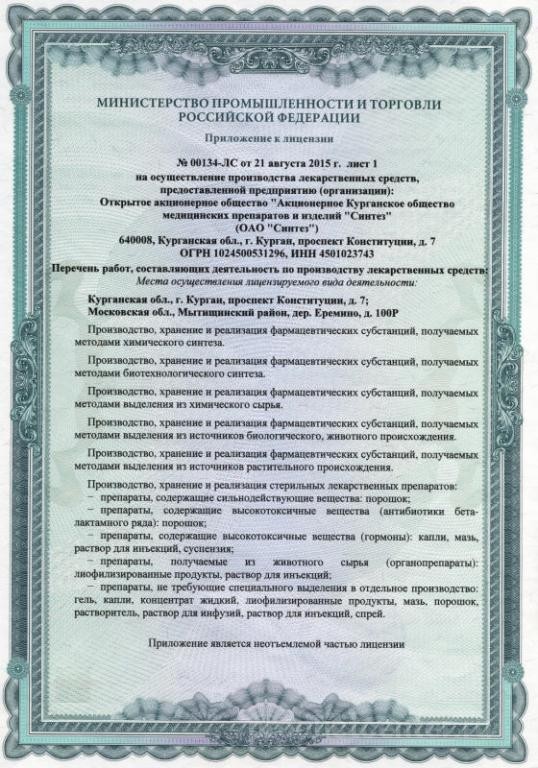 Российский комбинат по выпуску медикаментов и устройств для переливания крови. Изначально создавался как производитель промышленных антибиотиков. За годы работы комбинат расширил сферы свой деятельности и в настоящее время входит в список лидеров по производству лекарственных средств. ОАО «Синтез» изготавливает: активные фармацевтические субстанции; готовые лекарства; ветеринарные препараты; медицинские изделия из полимерных материалов. Каталог содержит около 300 маркировок лекарств. Завод имеет лицензию на выпуск рецептурных препаратов. Продукция «Синтез» реализуется не только в России, но и идет на экспорт.