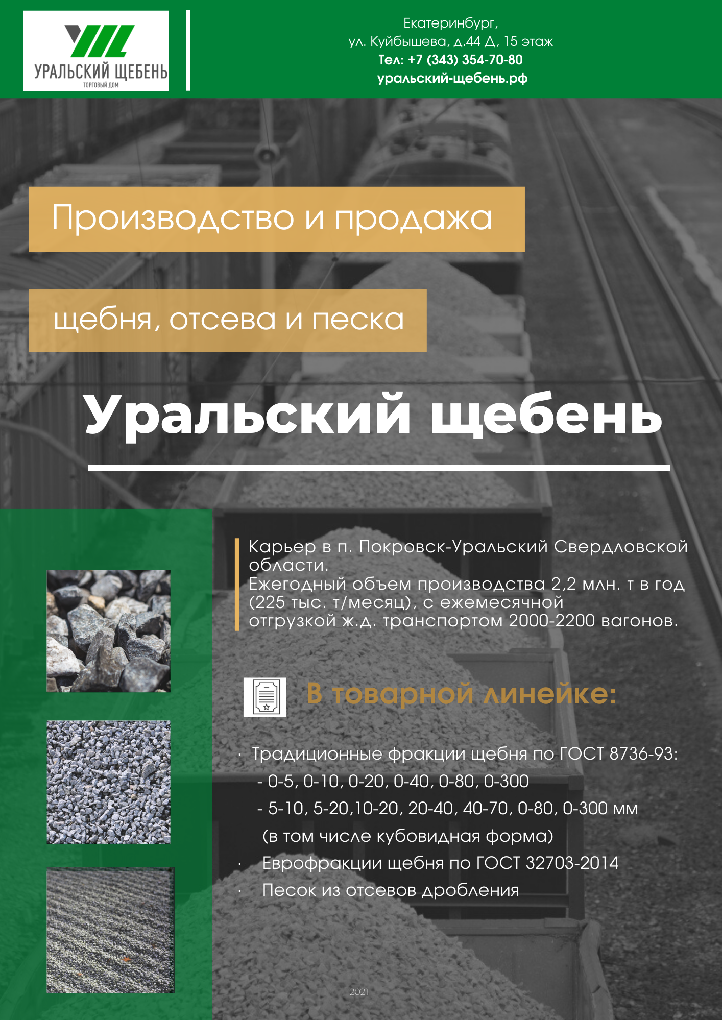 Отгрузка поизводится вагонами (18 000 в год), автотранспортом, доставка возможна водным транспортом. Выгодное расположение завода позволяет отправлять инертные грузы на объекты ХМАО, ЯНАО, Коми. Завод работает для нужд широкого круга потребителей: строительные компании, автодорожные и железнодорожные, добывающие компании, муниципальные застройщики.