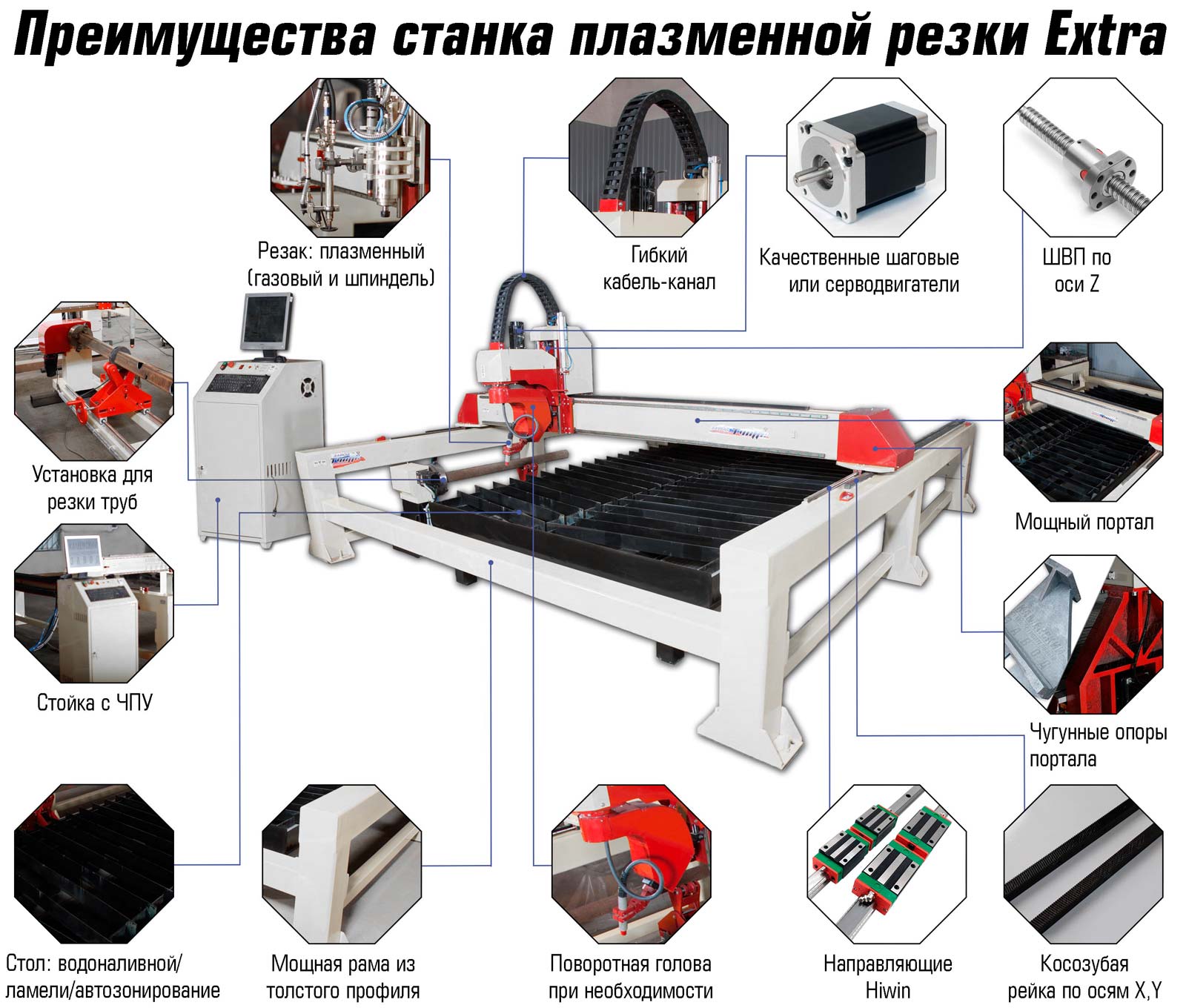 Плазменные 5 осевые станки с ЧПУ Extra – высокопрофессиональный инструмент для раскроя металла. Станок отличается высокой точностью резки, хорошей скоростью, высокими показателями надежности и долговечности.