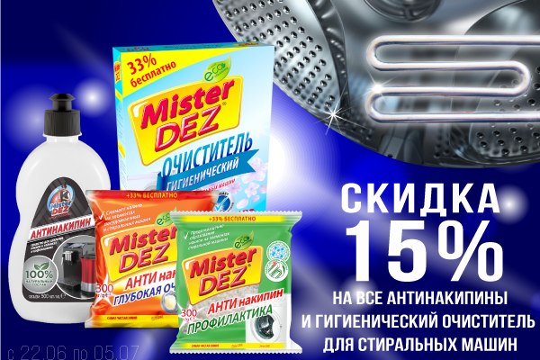 Условия акции: скидка 15% от базового прайса на все антинакипины Mister Dez.