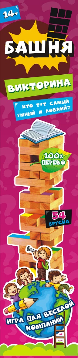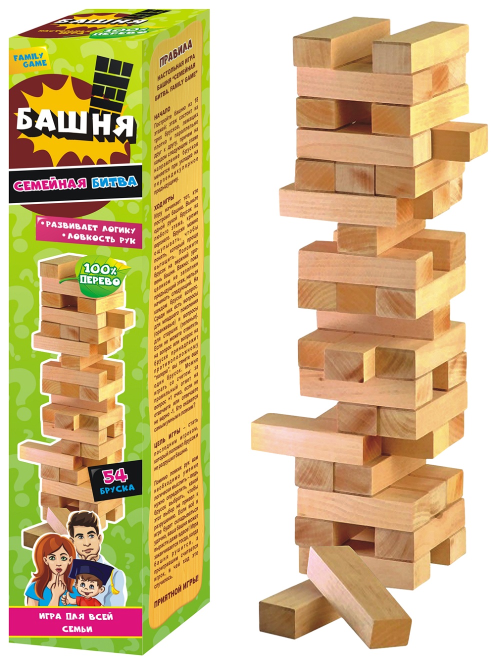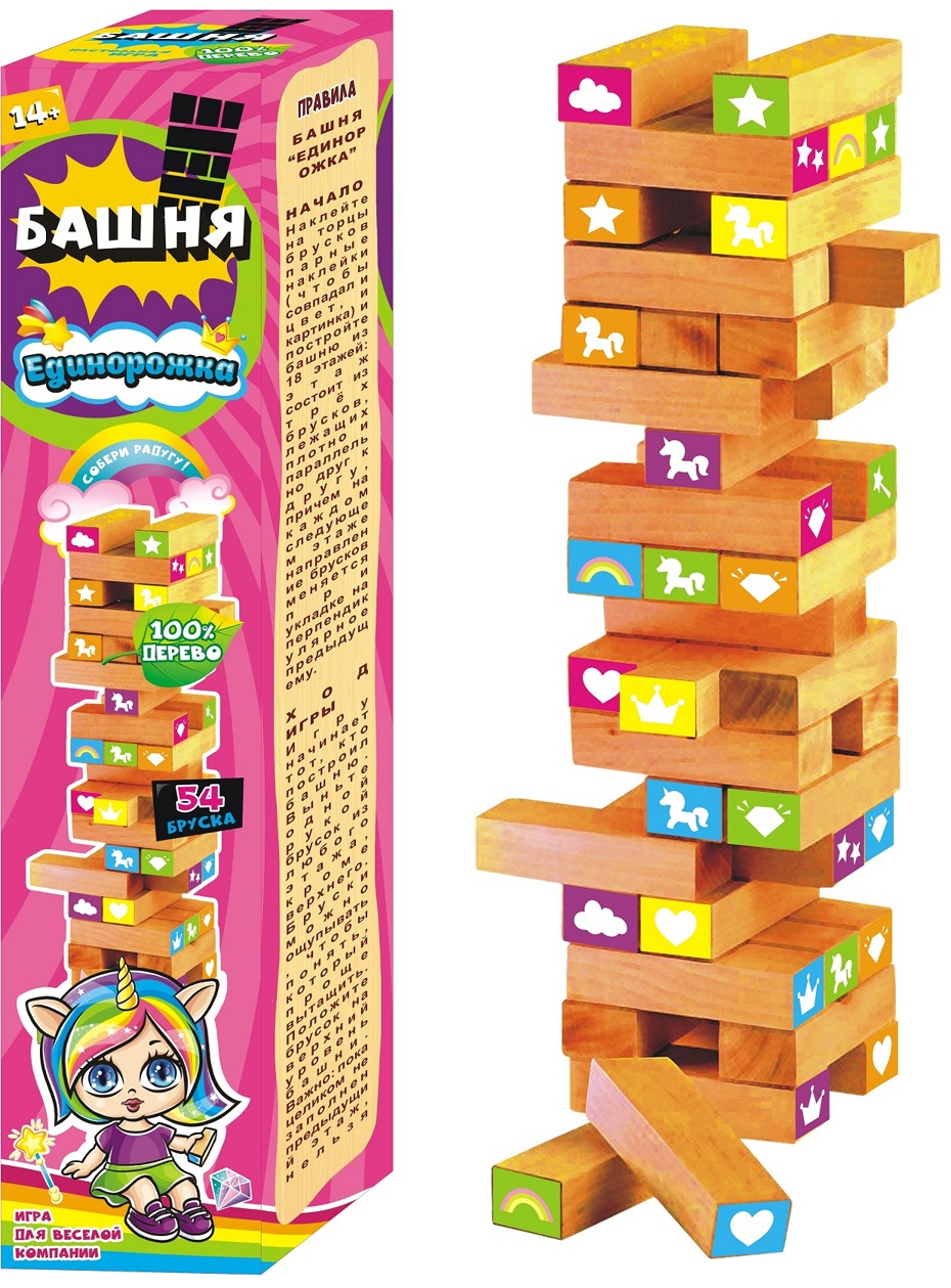 Настольная игра, где игроки по очереди достают бруски из башни и кладут их наверх, делая башню всё более высокой и всё менее устойчивой, не трогая верхний ряд. Размер коробки 7,2х32,8 см. 54 бруска. 100% дерево. Не подлежит обязательной сертификации.