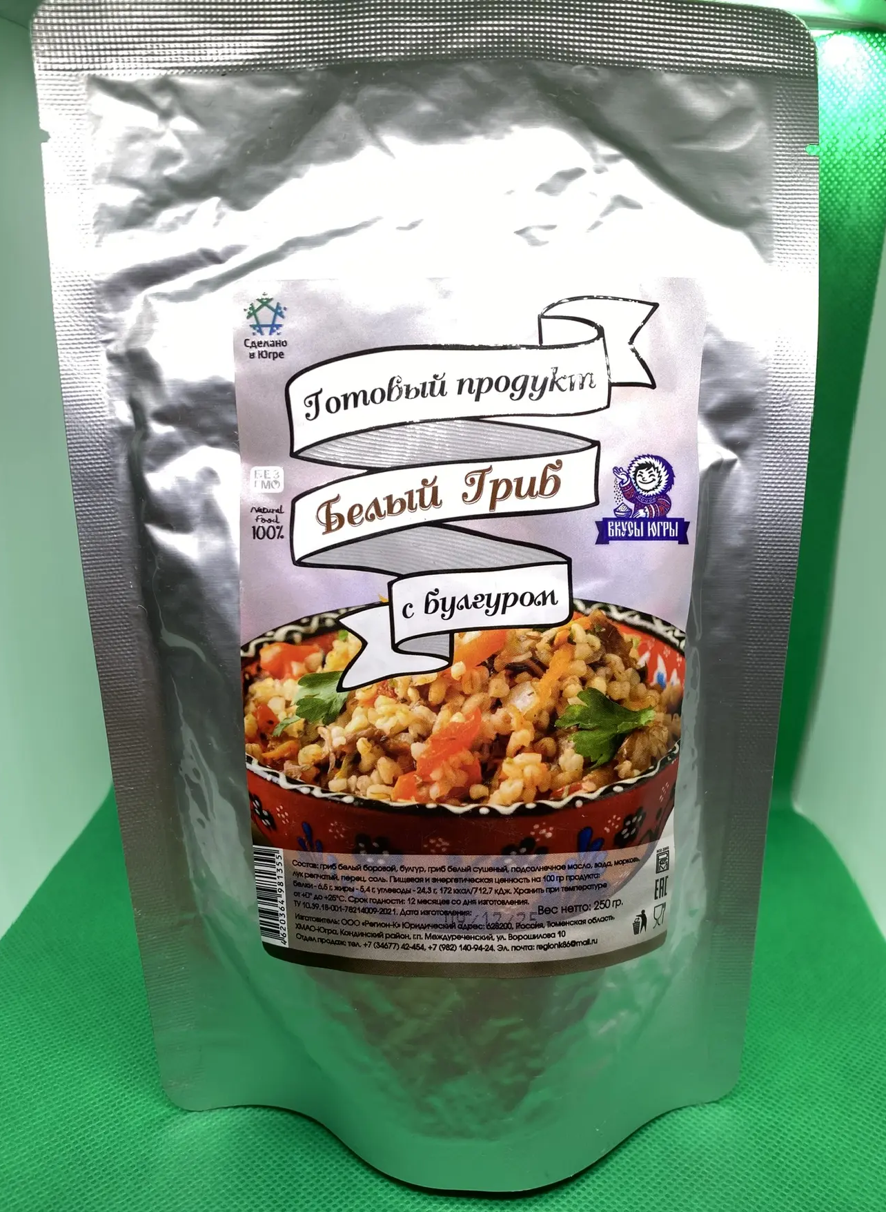 Белый боровой гриб с булгуром от компании ООО Регион-К ™Дары Югры. Место сбора дикоросов Ханты-Мансийский автономный округ — Югра. Состав: гриб белый боровой, булгур, гриб белый сушеный, подсолнечное масло, морковь, лук репчатый, перец, соль.