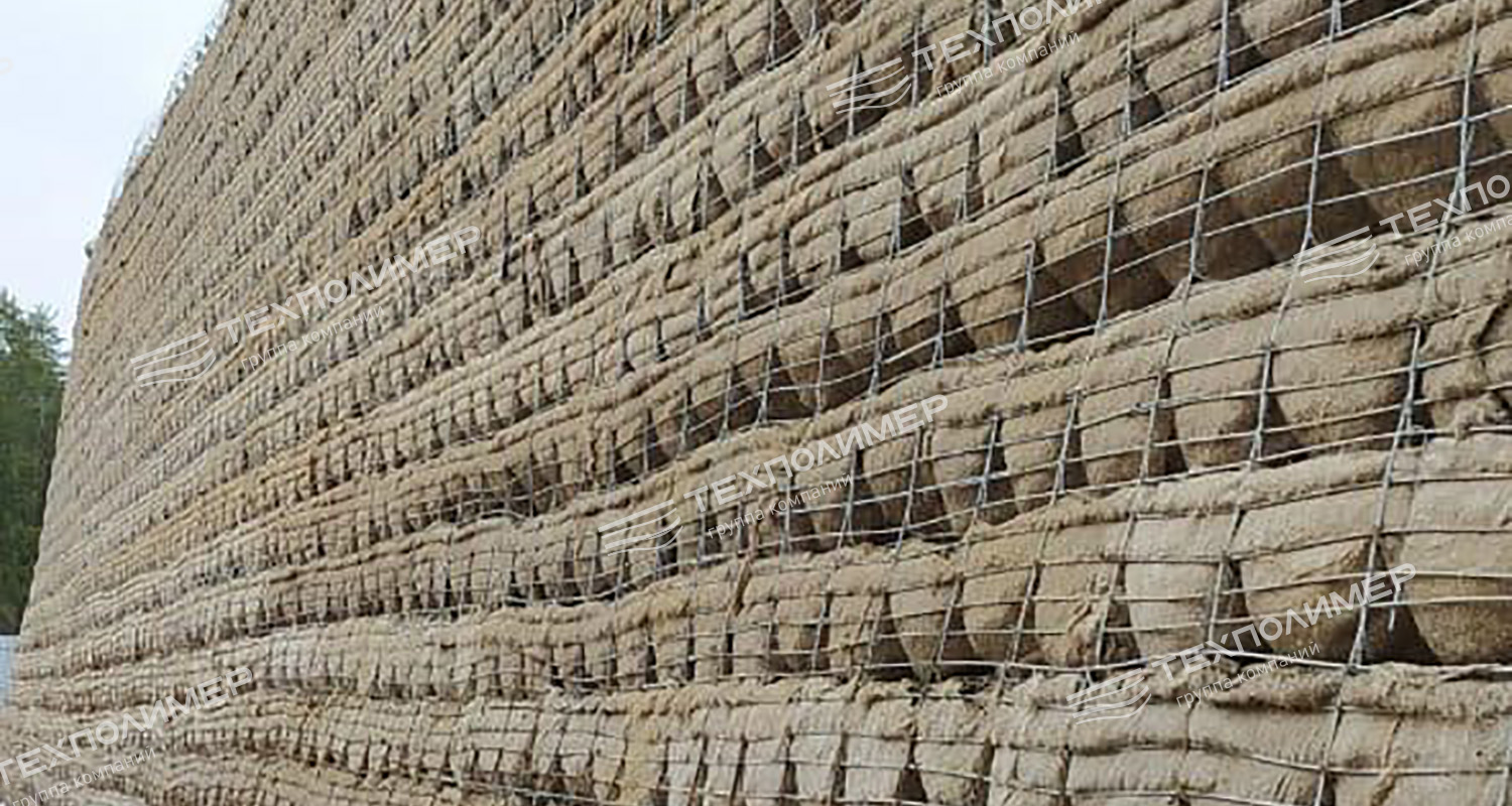 Биомат - это композитный, трехслойный материал. Состоит из двух слоев нетканого природного полотна и внутреннего слоя, содержащего семена трав и питательную смесь. Слои соединены между собой иглопробивным способом, благодаря чему достигается равномерное распределение и фиксация питательной смеси и семян трав внутри каркаса.