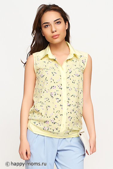Блузка для беременных лимонного цвета, без рукавов, классический отложной воротник, планка с пуговицами и воротник выполнены из материала однотонного цвета, низ изделия собран на резинку, объём на животик создаётся за счёт свободного кроя в области животика. Цветочный принт, безо всяких сомнений является главным трендом весенне-летнего сезона. Яркий, свежий, он способен добавить хорошее настроение и романтику любому образу. Блузка с цветочным принтом - один из самых женственных элементов гардероба модниц. Эту одежду поистине можно считать многофункциональной, ведь она способна освежить любой образ и сочетается с разноплановыми низами на радость девушкам! Отлично смотрится как на любом сроке беременности, так и после рождения малыша.