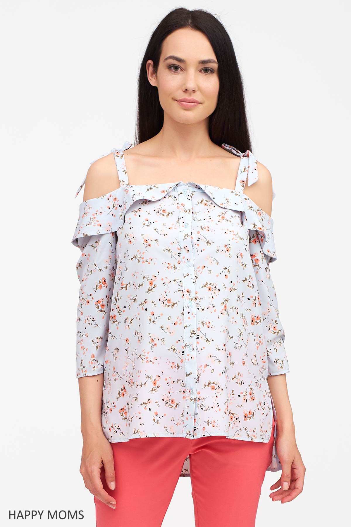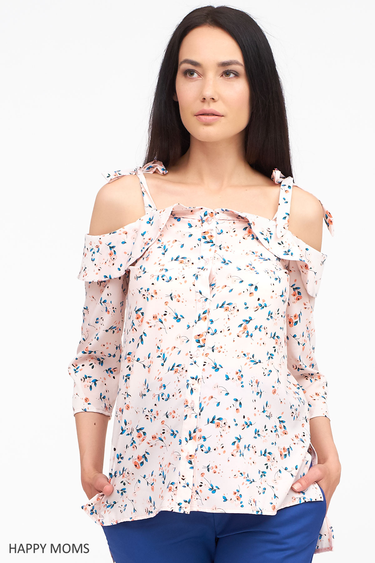 Блузка для беременных с цветочным принтом, рукав 3/4, открытые плечи, на широких регулируемых бретелях, декорирована воланом, объём на животик создается за счёт кроя изделия. В этом году дизайнеры предлагают нам открывать одну из самых сексуальных частей женского тела - плечи и ключицы. Это выглядит свежо, интересно и стильно, поэтому блузка с открытыми плечами, быть может даже не одна, просто обязана занять место в вашем шкафу. Блуза с открытыми плечами, нежного голубого цвета с цветочным принтом являет собой воплощение нежности, женственности и романтичности.