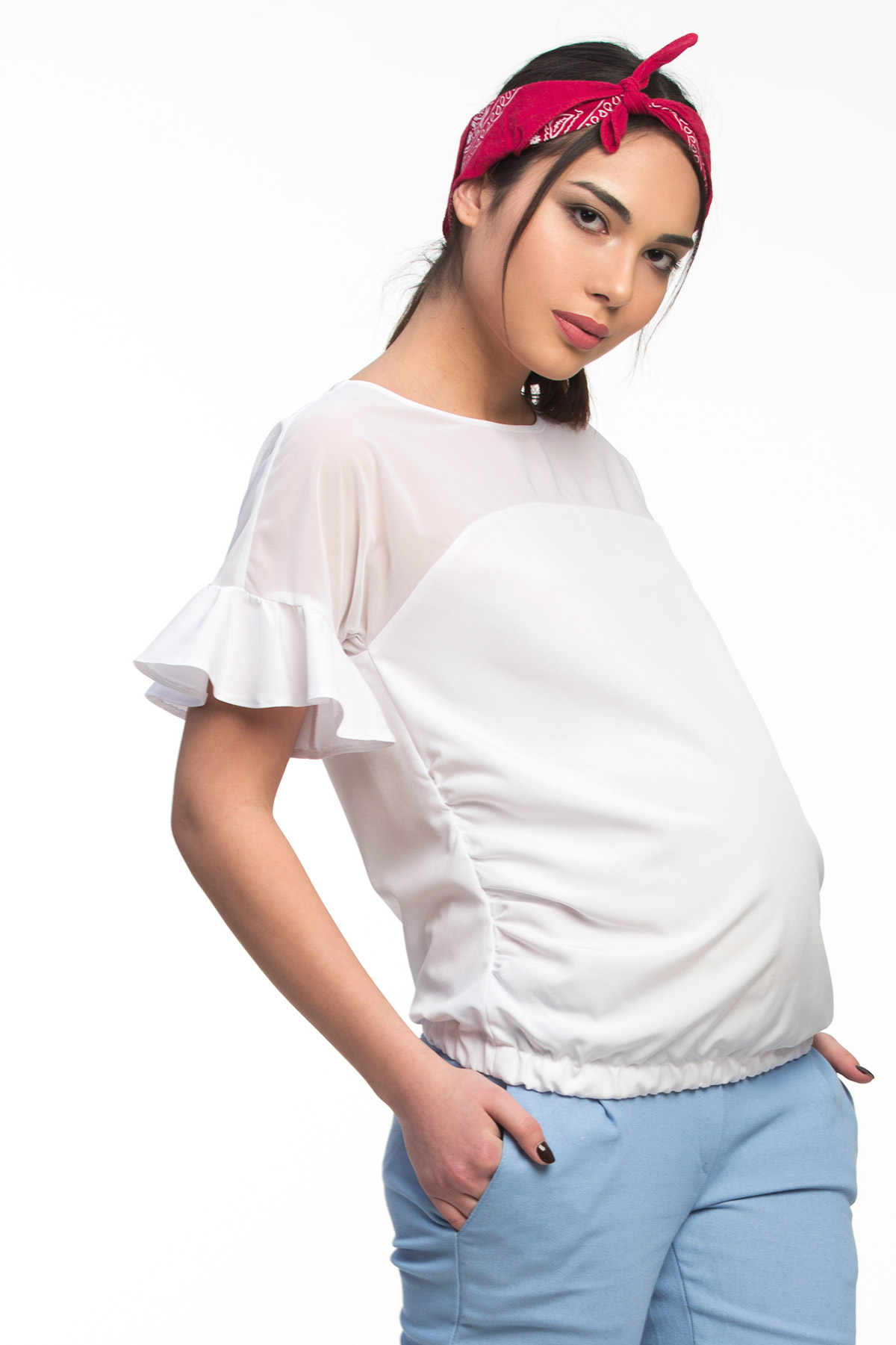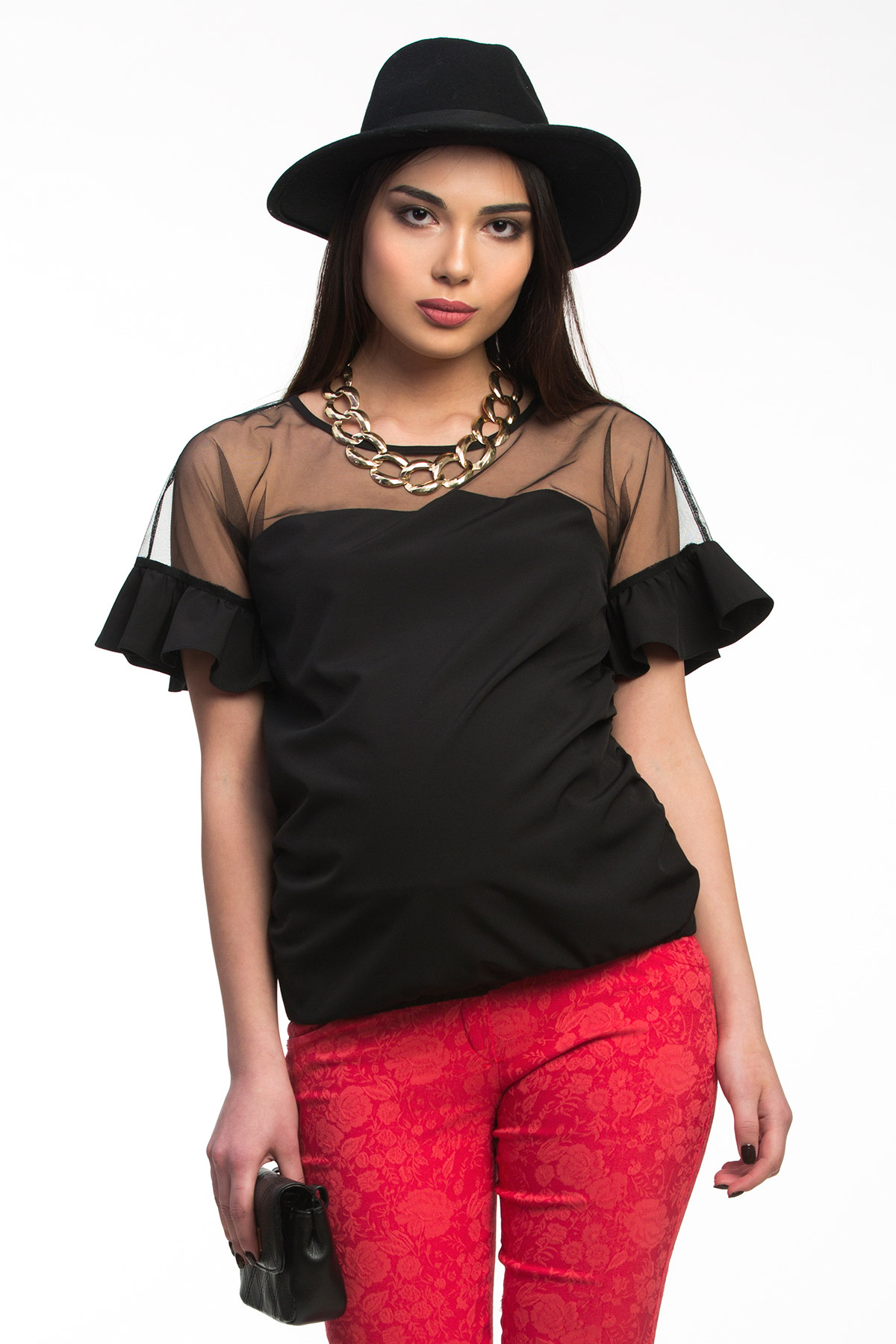 Элегантная блузка для беременных с сеткой. Объем на животик создается за счет аккуратной сборки по боковым швам. Планка на резинке снизу отлично фиксирует модель на бедрах и обеспечивает ей великолепную посадку на фигуре, независимо от срока беременности. Блузка универсальна по стилистике, обыгранная красивой бижутерией и аксессуарами она легко перевоплощается в вечерний вариант. А скомбинированная с демократичными джинсами и обувью на низком ходу так же легко становится элементом каждодневного кэжуал-стиля. Обратите внимание на оригинальную вставку из эластичной сетки и приспущенные рукава с воланами – сегодня это трендовые элементы кроя, и они здесь присутствуют во всей своей красе.