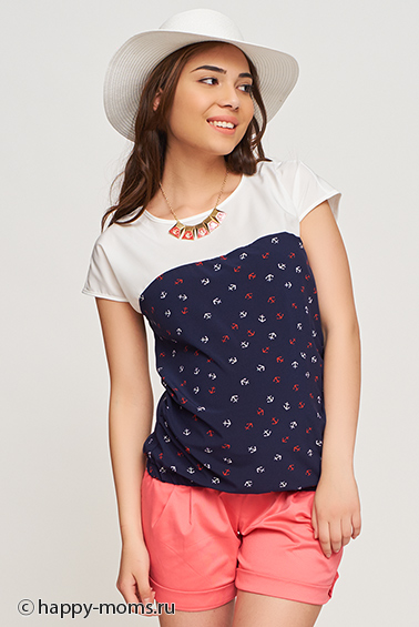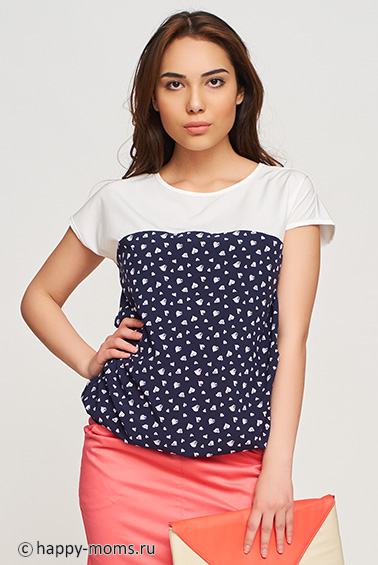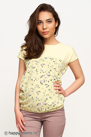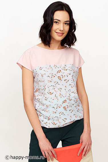 Комбинированная блузка для беременных, без рукавов, округлый вырез горловины, низ изделия собран на резинку, объём на животик создаётся за счёт свободного кроя в области животика. Отлично смотрится как во время беременности, так и после рождения малыша! На фото: модель, рост 170 см., обхват груди - 85 см, обхват бедер 94 см, имитация 5-го месяца беременности.
