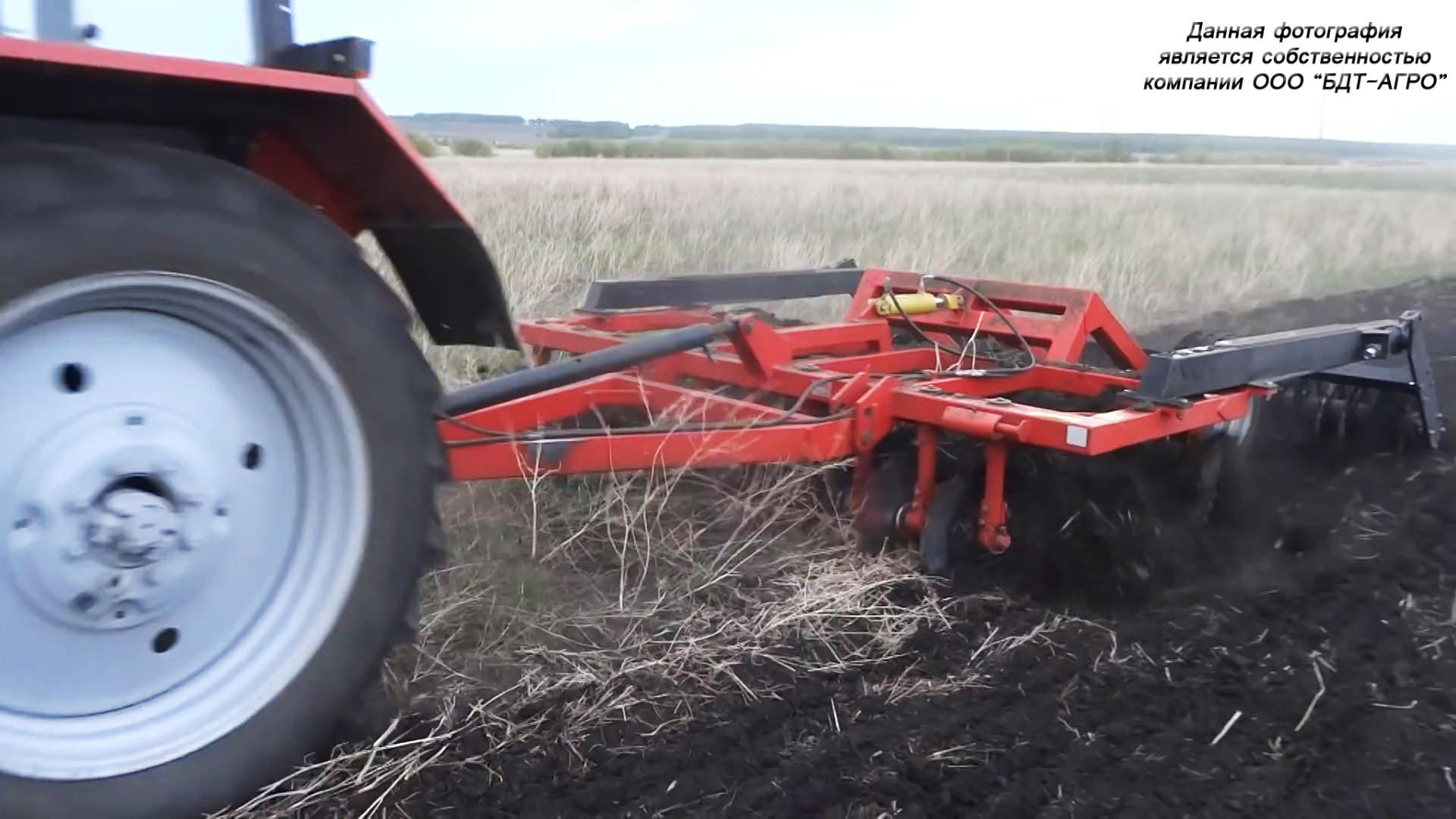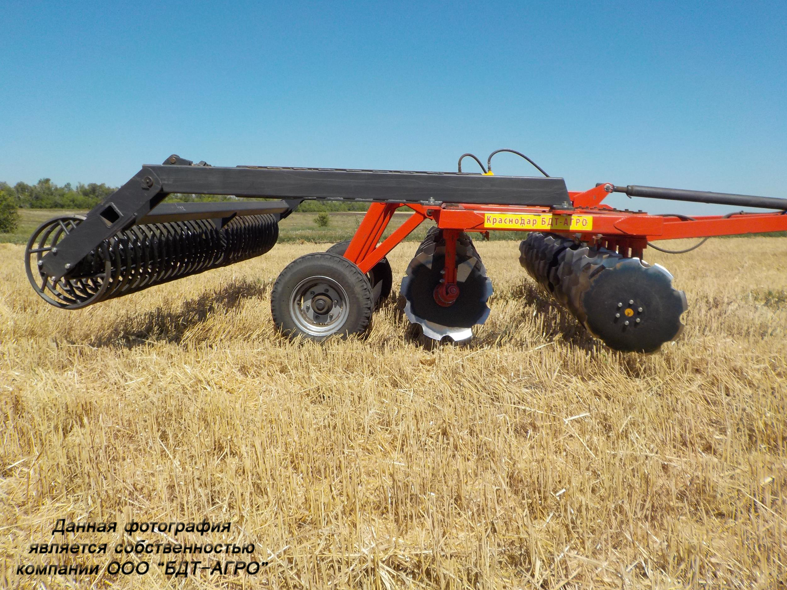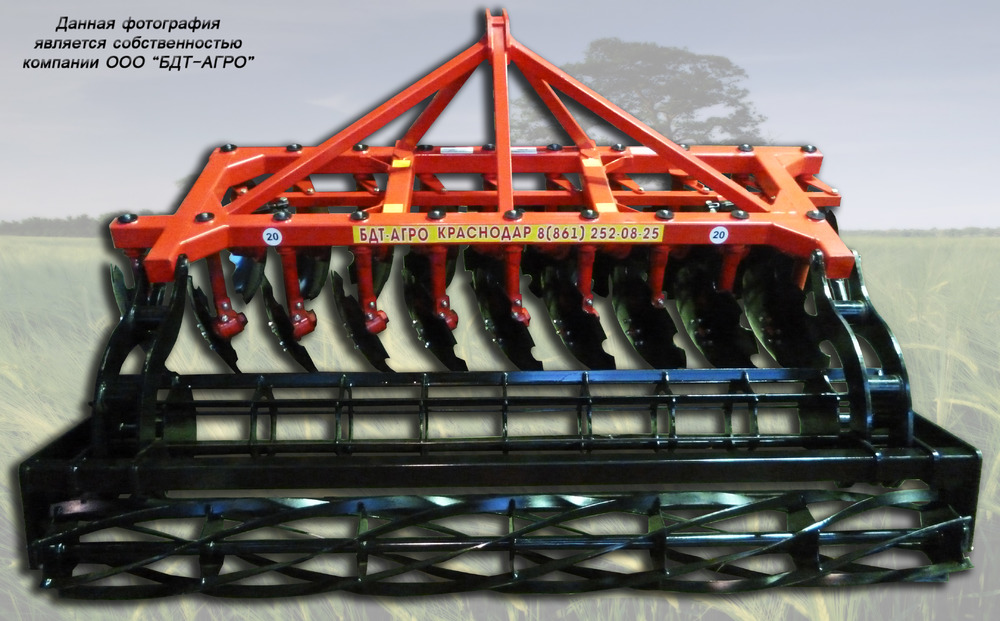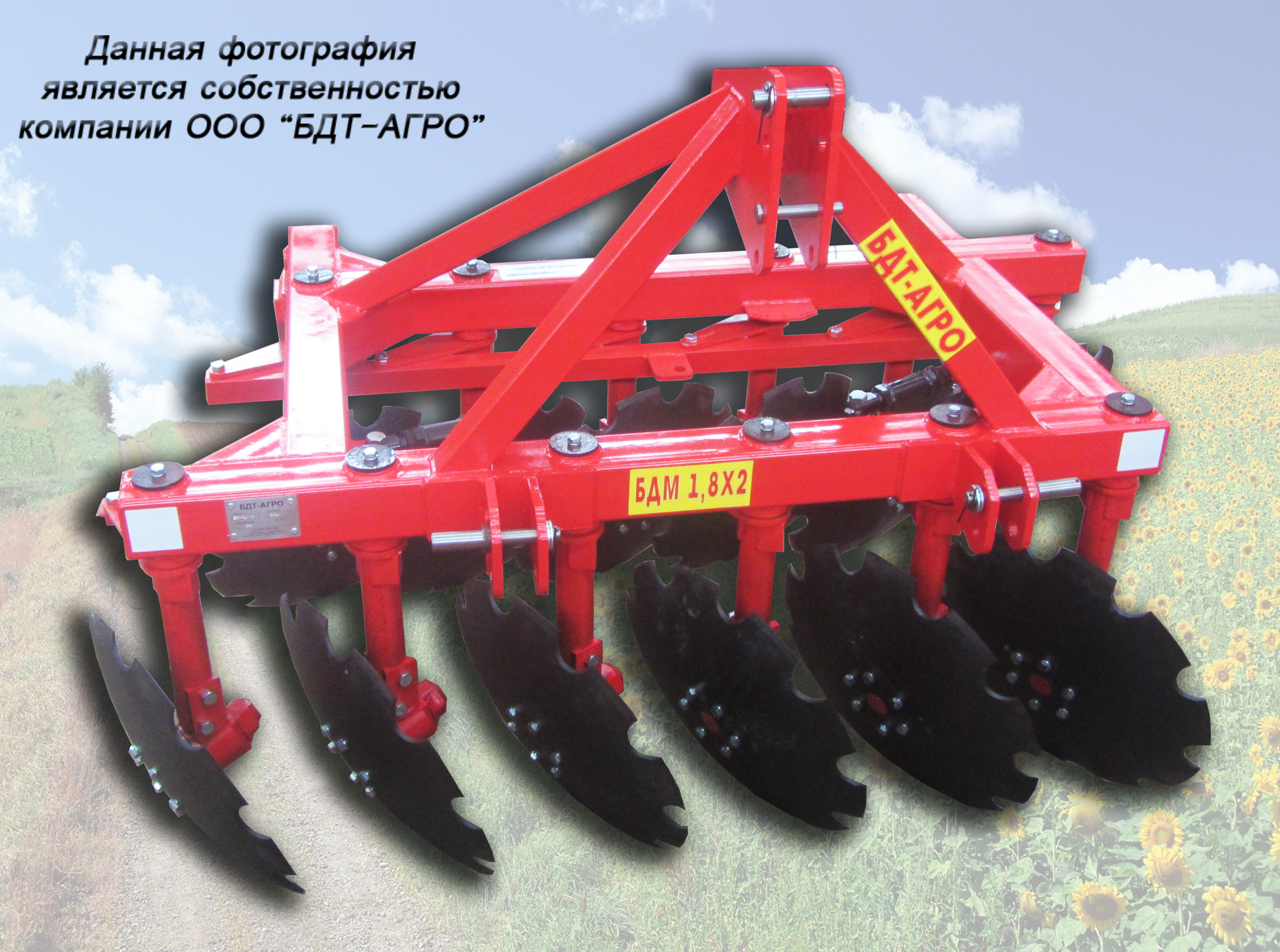Двухрядная борона дисковая модернизированная БДМ с подшипниковым узлом внутри сферы диска, с дисками на индивидуальной стойке, с изменением угла атаки дисков синхронно в каждом ряду, предназначена для поверхностной обработки почвы на глубину до 15см, уничтожения сорняков и измельчения пожнивных остатков. За счет равномерного перемешивания земли с растительными остатками эффективно применение бороны дисковой на почвах подверженных ветровой и водной эрозии. Растительные остатки, равномерно перемешанные с верхним слоем почвы, защищают почву от выдувания и вымывания, улучшают воздушный обмен. При этом растительные остатки, находясь в земле, активно превращаются в перегной, повышая плодородие почвы.