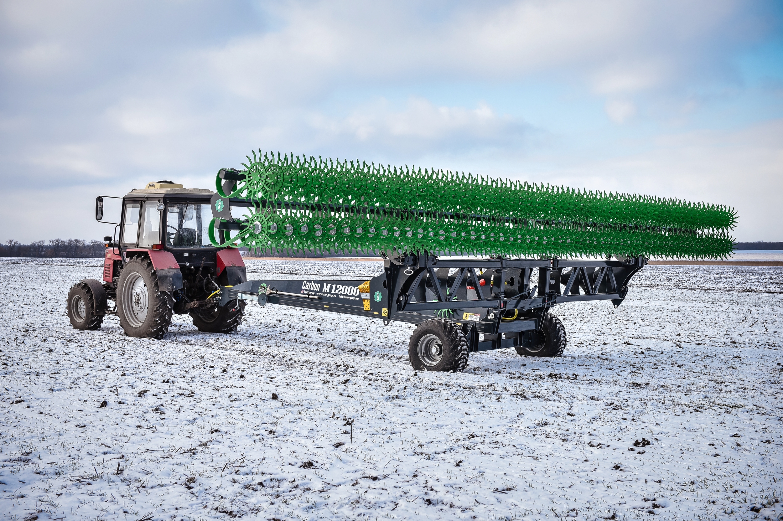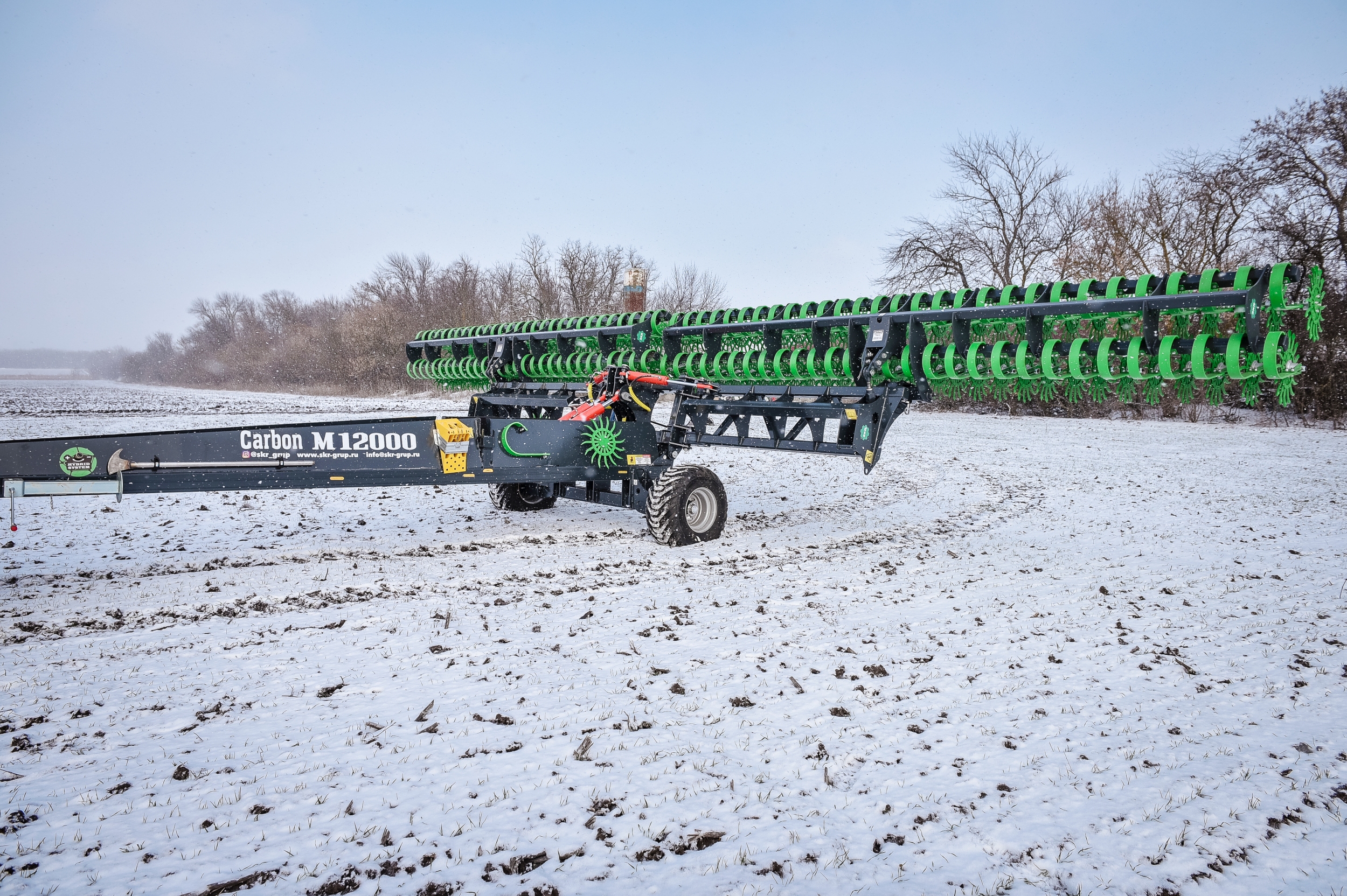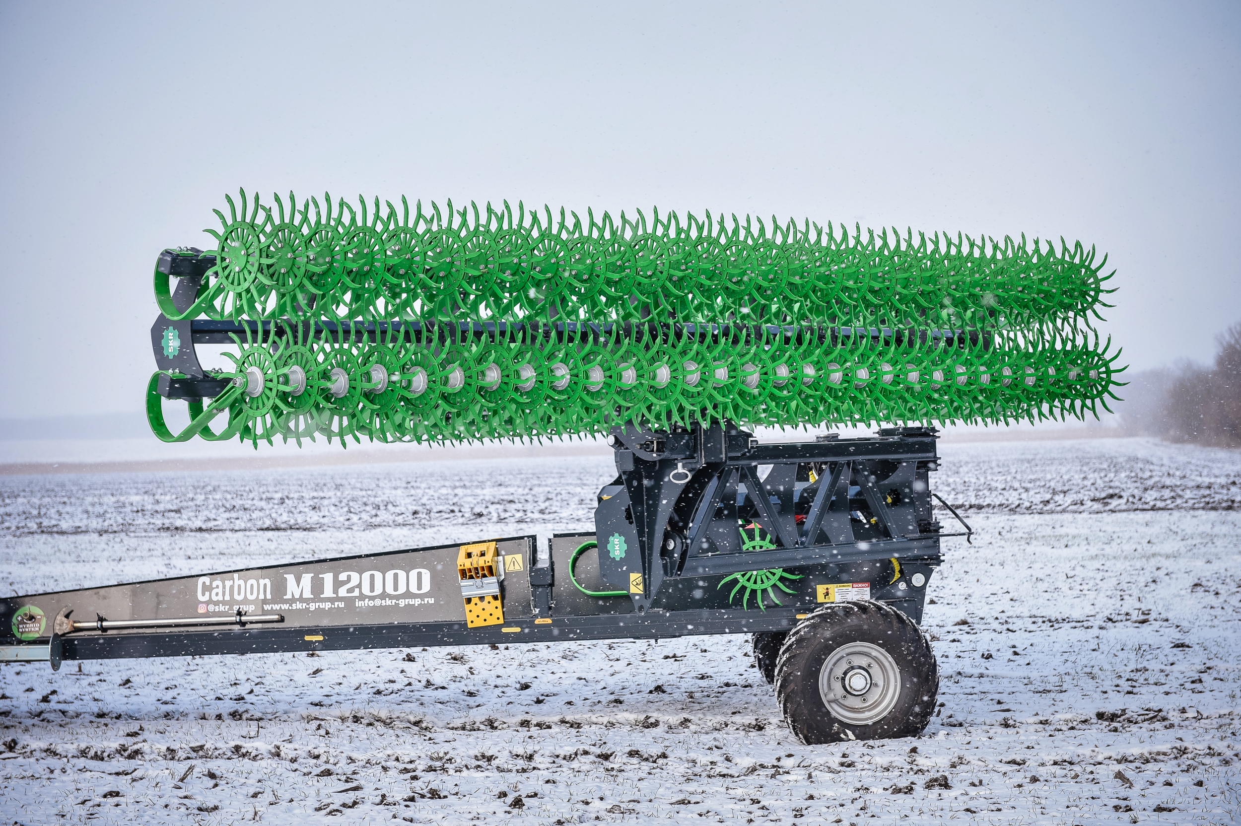 Борона ротационная мотыга Carbon М12000 состоит из сцепки Carbon M12000 и двух Carbon M6000, что позволяет работать как целым агрегатом шириной захвата 12 метров, так и отдельно 6-метровыми боронами мотыгами, которые агрегатируются с тракторами типа МТЗ-82.1, МТЗ-82.2 и другими. Предназначена для обработки почвы на глубину до 50 мм. Борона ротационная мотыга уничтожает весь сорняк-однолетку в фазе нитки, образует верхний смульчированный слой насыщенный азотом, что активизирует бактерии в 1000 раз и позволяет сохранить влагу для питания растений.