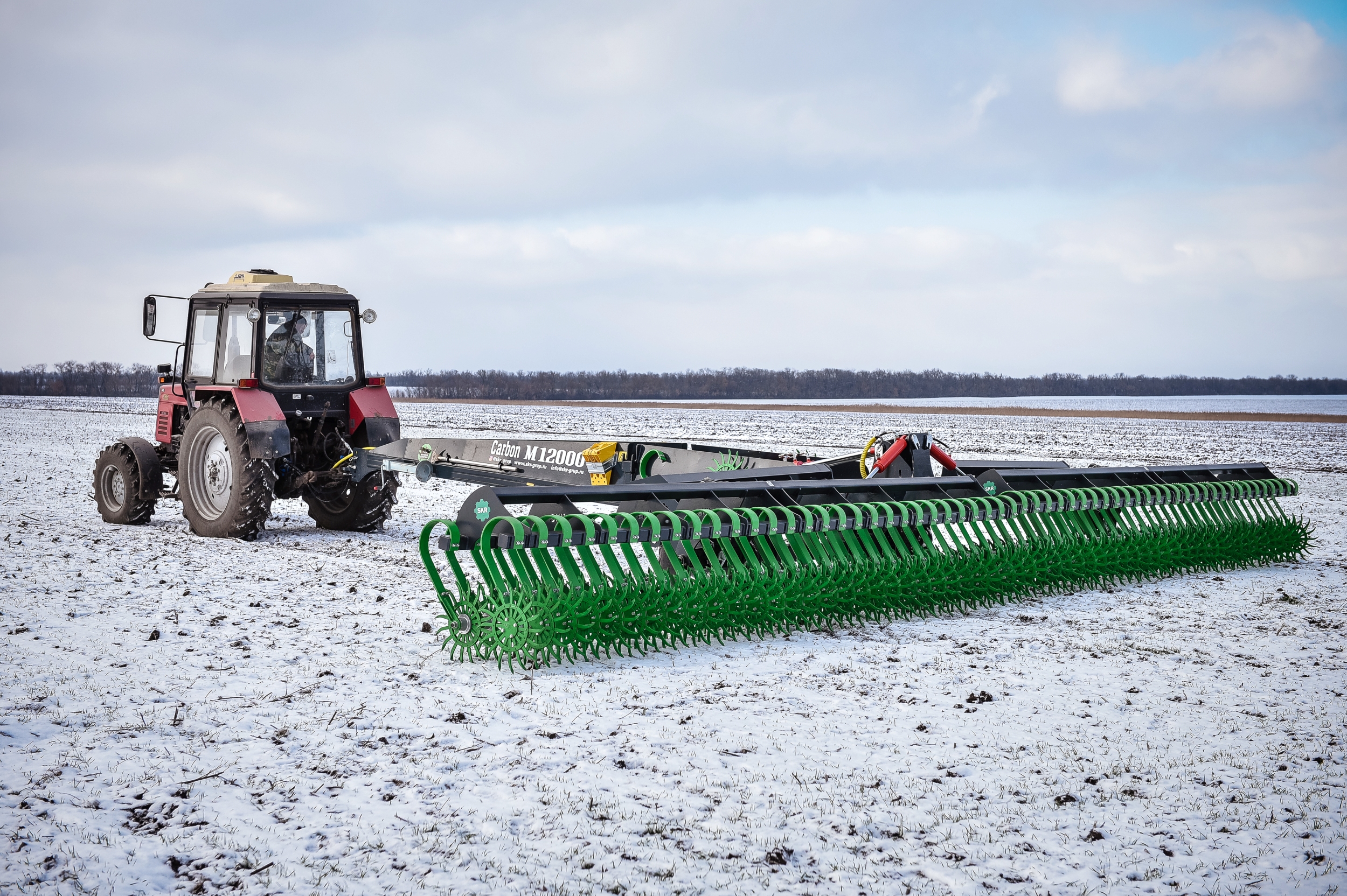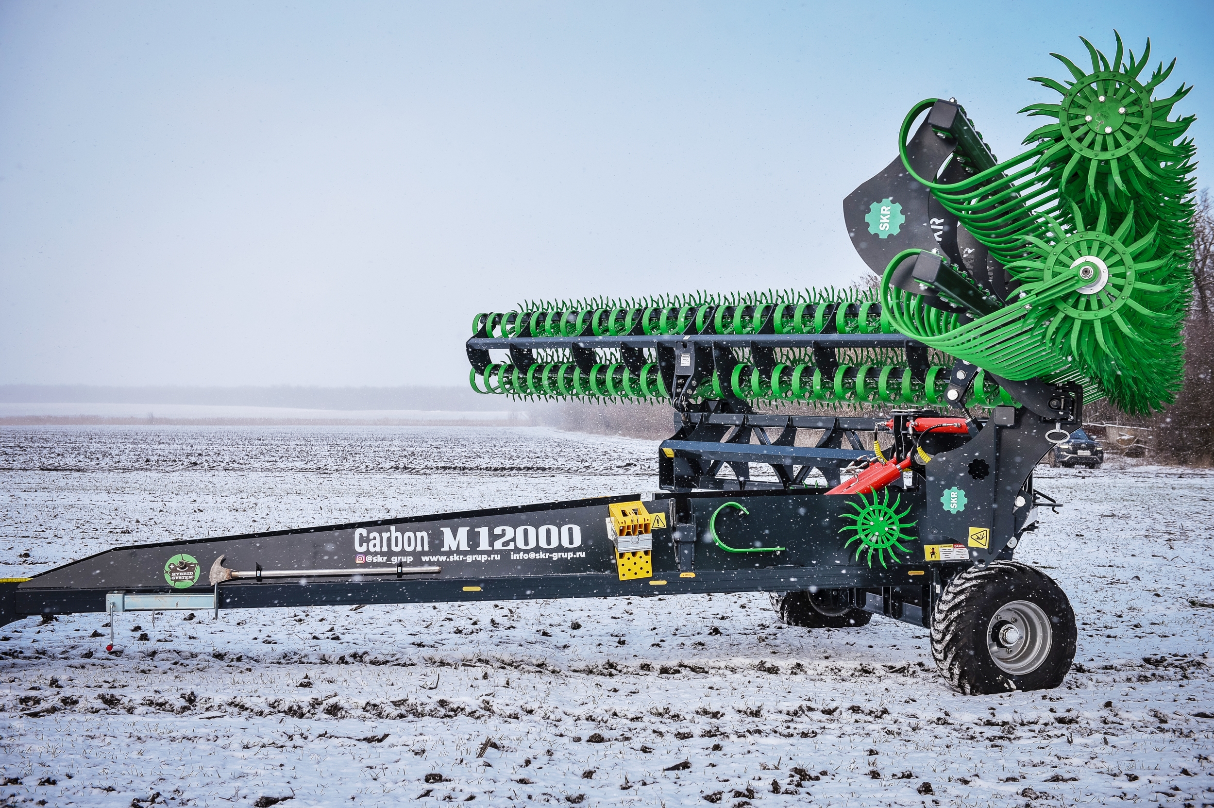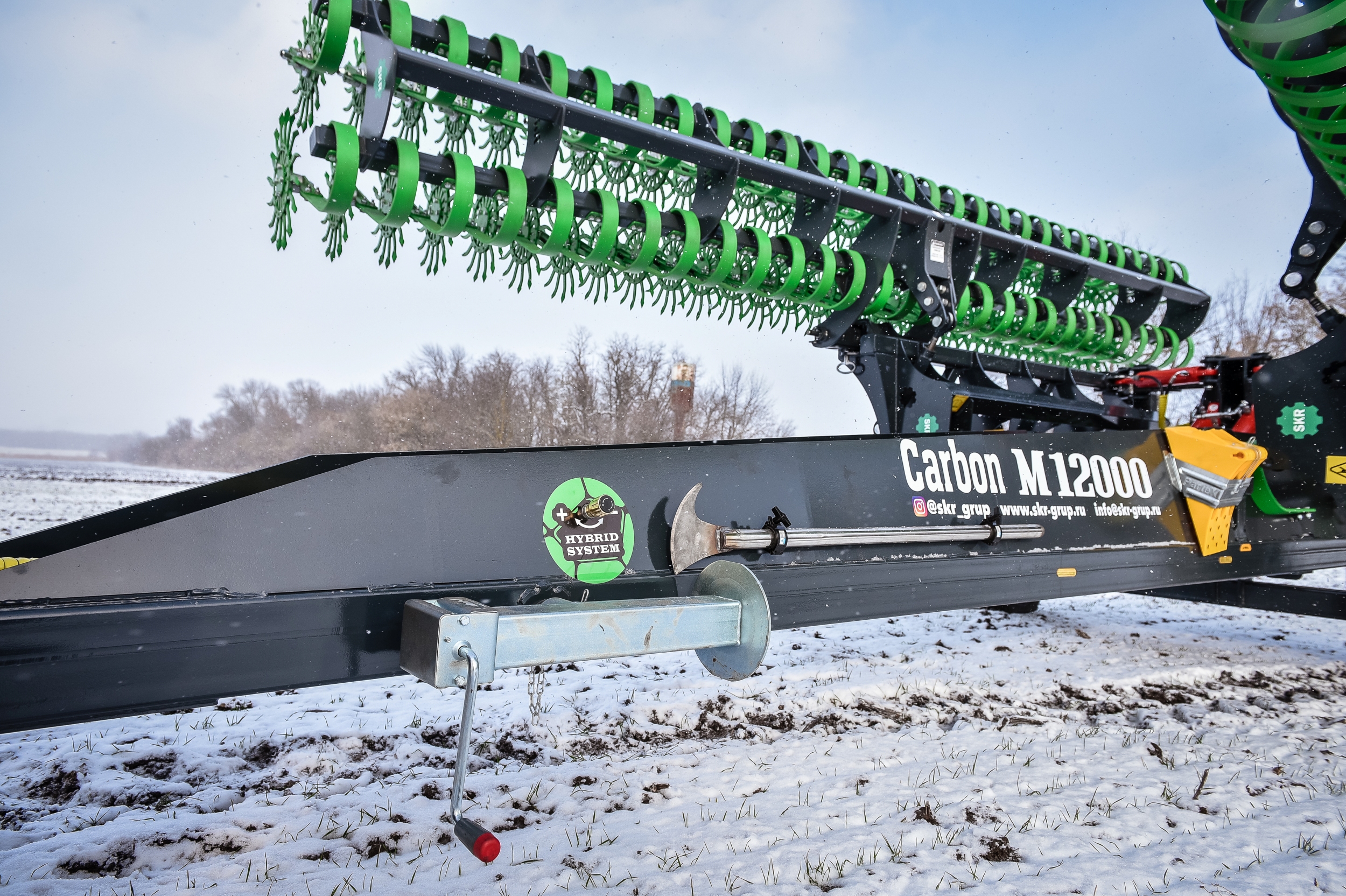 Борона ротационная мотыга Carbon М12000 состоит из сцепки Carbon M12000 и двух Carbon M6000, что позволяет работать как целым агрегатом шириной захвата 12 метров, так и отдельно 6-метровыми боронами мотыгами, которые агрегатируются с тракторами типа МТЗ-82.1, МТЗ-82.2 и другими. Предназначена для обработки почвы на глубину до 50 мм. Борона ротационная мотыга уничтожает весь сорняк-однолетку в фазе нитки, образует верхний смульчированный слой насыщенный азотом, что активизирует бактерии в 1000 раз и позволяет сохранить влагу для питания растений.