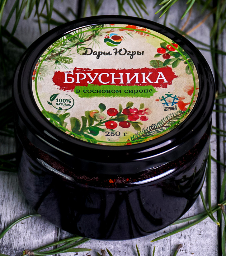 Брусника лесная - дикорастущая, в сосновом сиропе из молодых сосновых шишек, от компании Регион-К "Дары Югры". Место сбора дикоросов Ханты-Мансийский автономный округ - Югра. Состав: сосновый сироп (молодая шишка сосны, сахар, вода), брусника лесная.