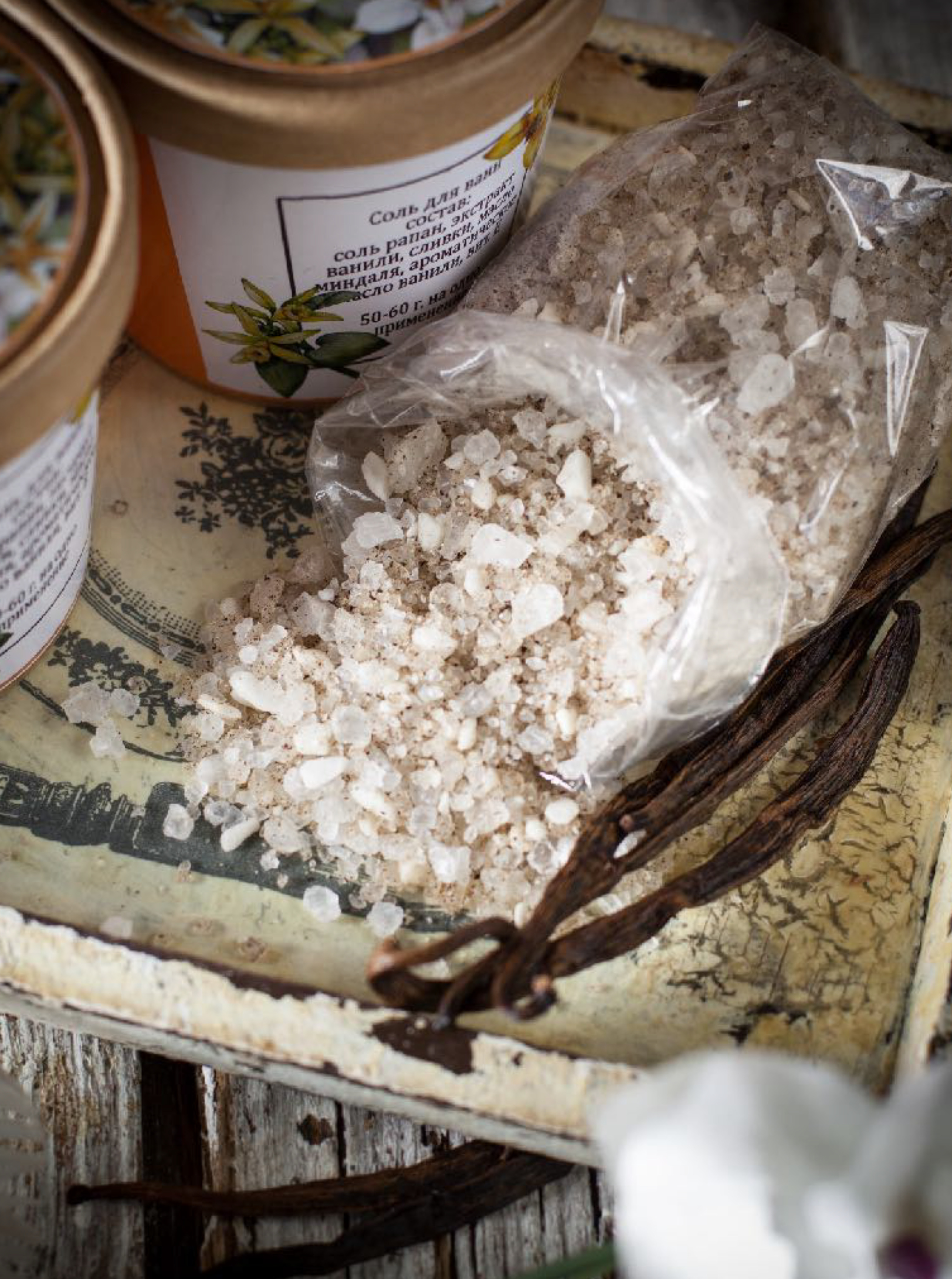 В составе: соль морская/соль сакская/соль рапан (сульфидно-иловая, речная), эфирные масла, жирные масла, витамин е, экстракты цветов и растений.