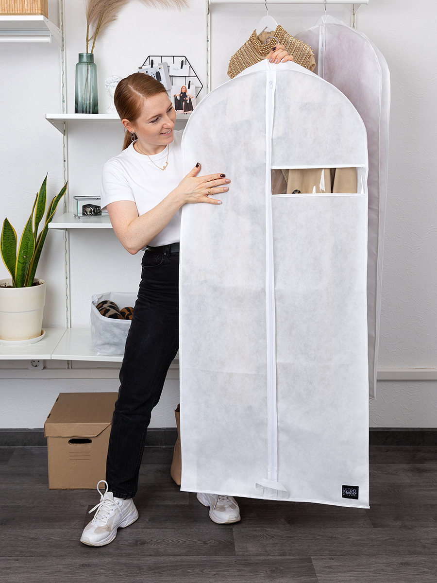 Объёмный чехол на молнии с прозрачным окном и ручкой для хранения и транспортировки длинной одежды/кофр для хранения одежды. Чехол изготовлен из нетканого материала, который обеспечивает естественную вентиляцию. Спанбонд плотностью 70 г/м2. С прозрачным окошком и ручкой. Плотный материал, хорошо держит форму. Прочно вшитая молния. Чехол предотвращает сминание вещей, оберегает от пыли и загрязнений. Область применения - хранение одежды. С учётом плечиков длина вещи должна быть на 5-7 см короче чехла. Подходит для длинных пальто, шуб. Можно поместить 2 вещи в одном чехле. Изделие не подлежит техническому обслуживанию и ремонту.