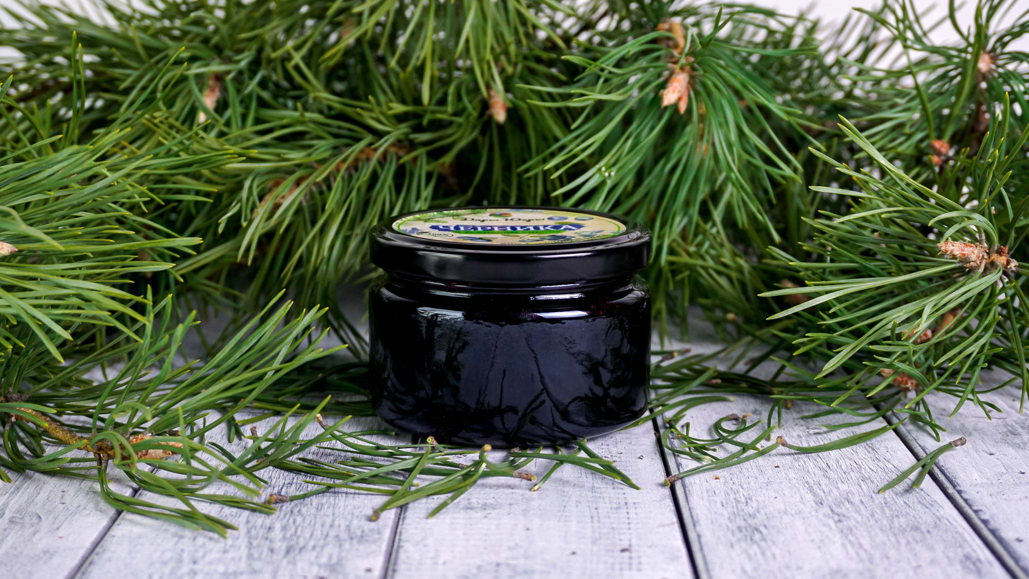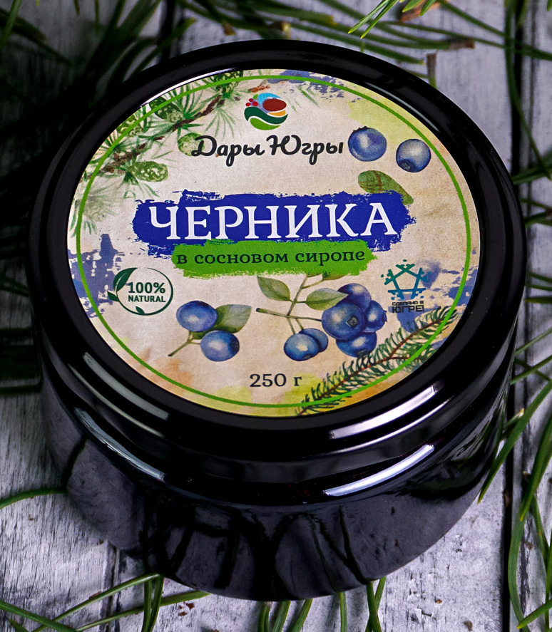 Черника лесная - дикорастущая, в сосновом сиропе из молодых сосновых шишек, от компании Регион-К "Дары Югры". Место сбора дикоросов Ханты-Мансийский автономный округ - Югра. Состав: сосновый сироп (молодая шишка сосны, сахар, вода), черника лесная.