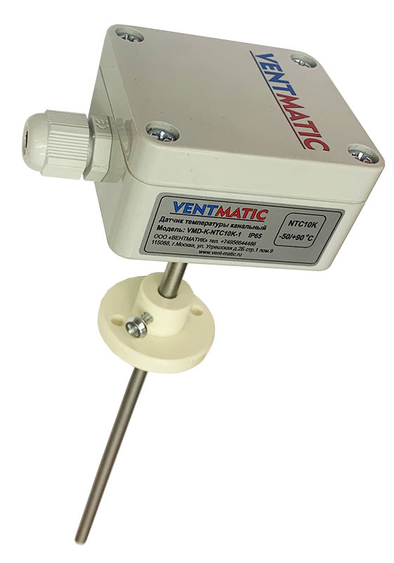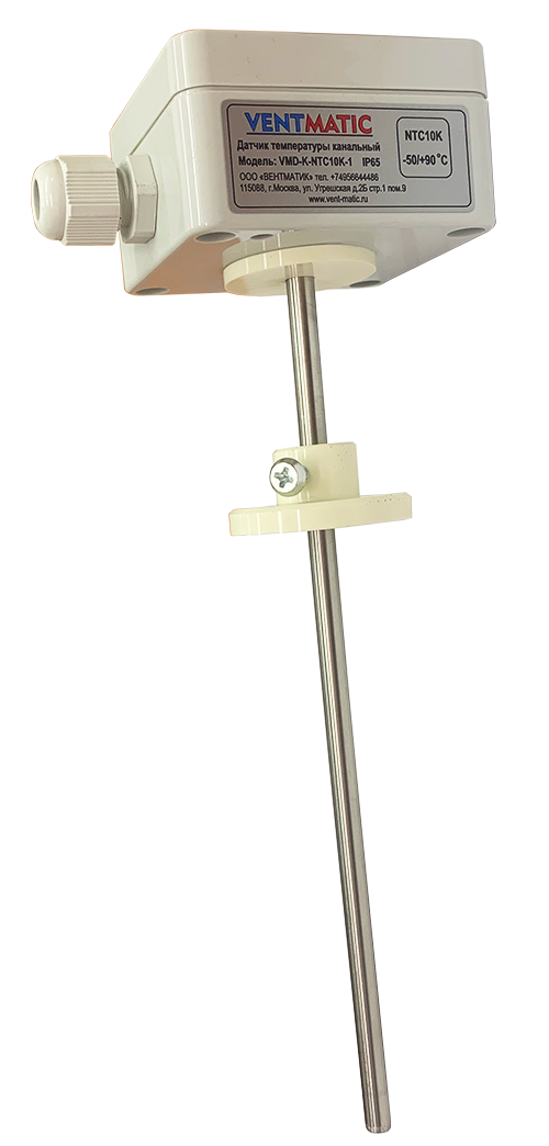Пассивные датчики температуры серии VMD-К предназначены для измерения температуры в воздушных каналах вентиляционных систем круглого и прямоугольного сечений. Датчики устанавливаются непосредственно на поверхность воздуховодов через фиксатор положения штока. Фиксатор положения позволяет разместить и зафиксировать чуствительный элемент датчика на расстоянии от 20 мм до 180 мм вглубь воздушного канала. Датчики подключаются к контроллеру системы и передают на него сигнал сопротивления, который электронным контроллером преобразуется в значение температуры.  Датчики серии VMD-К выпускаются в изолированных корпусах с защитой IP 65, что позволяет использовать в промышленных помещениях с повышенной влажностью и повышенным содержанием твердых частиц и аэрозолей в воздухе. Корпус датчиков серии VMD-К выполнен из высококачественного ABS пластика и может эксплуатироваться при низких (до -50С) и высоких (до +90С) температурах.