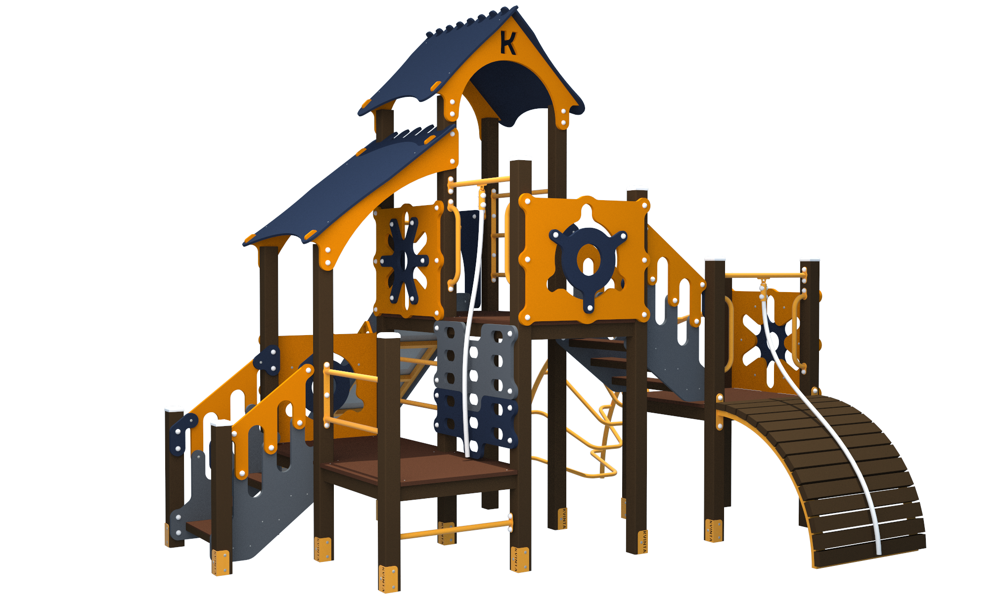 Комплекс состоит из двух башен и трех полубашен, имеет односкатную и двускатную крыши. Высоты полов 600, 900 и 1500 мм. Включает в себя трап «Барабан» с канатом, лаз «Лиану», фигурный лаз с канатом, две лестницы и скат высотой 1500 мм.