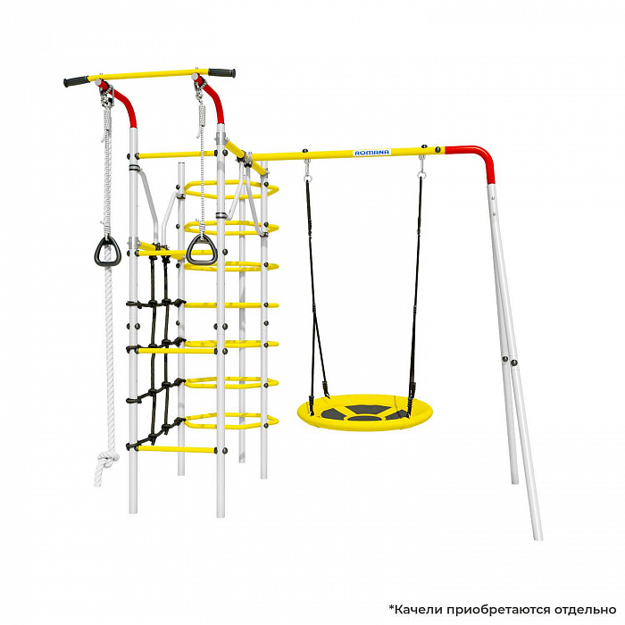 Комплект включает в себя множество игровых элементов для детей разных возрастных групп (от трех лет и старше): кольцевой лаз, турник, сетка лаза, канат, кольца, и качели на выбор.