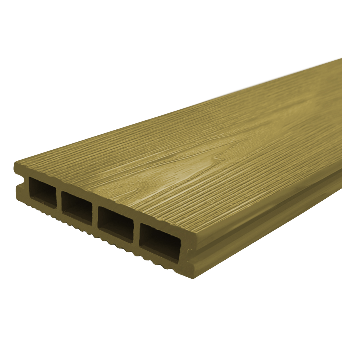 Композитная основа обеспечивает устойчивость к влаге, воздействию ультрафиолета и перепадам температур в течение сезонов. Доска сохраняет первоначальный оттенок, не подвержена деформации и длительное время остаётся аккуратной при использовании на улице. Рельефная поверхность с выразительной древесной фактурой создаёт визуально цельное и ровное покрытие.