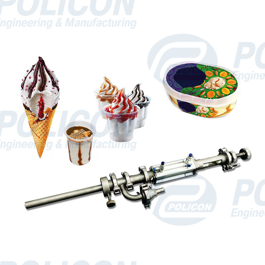 - при работе с насадками на дозаторах открытого и закрытого типа (распределение джема по сечению тары в виде змейки; ввод джема в поток мороженого и (или) полив внешней поверхности мороженого).