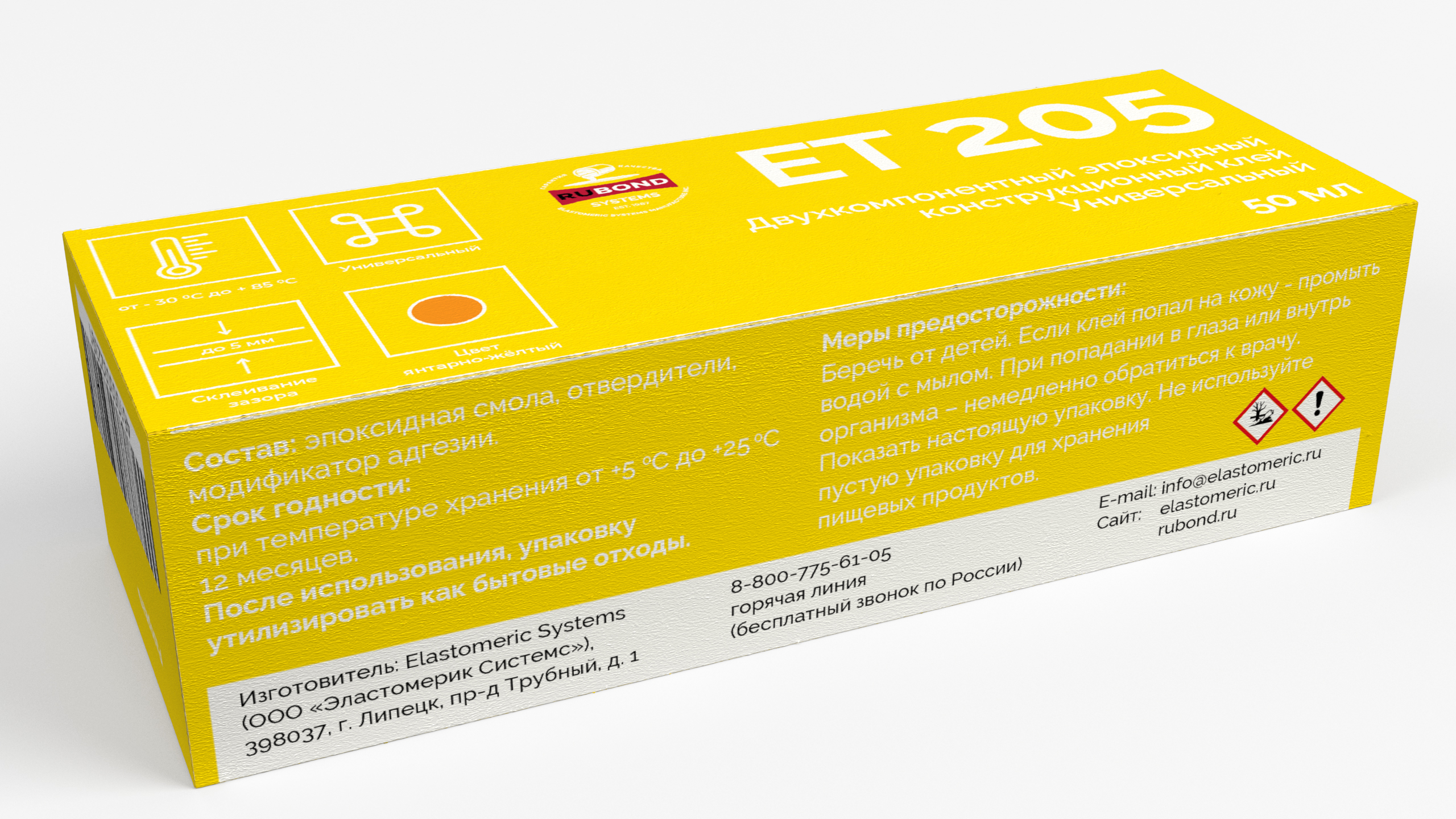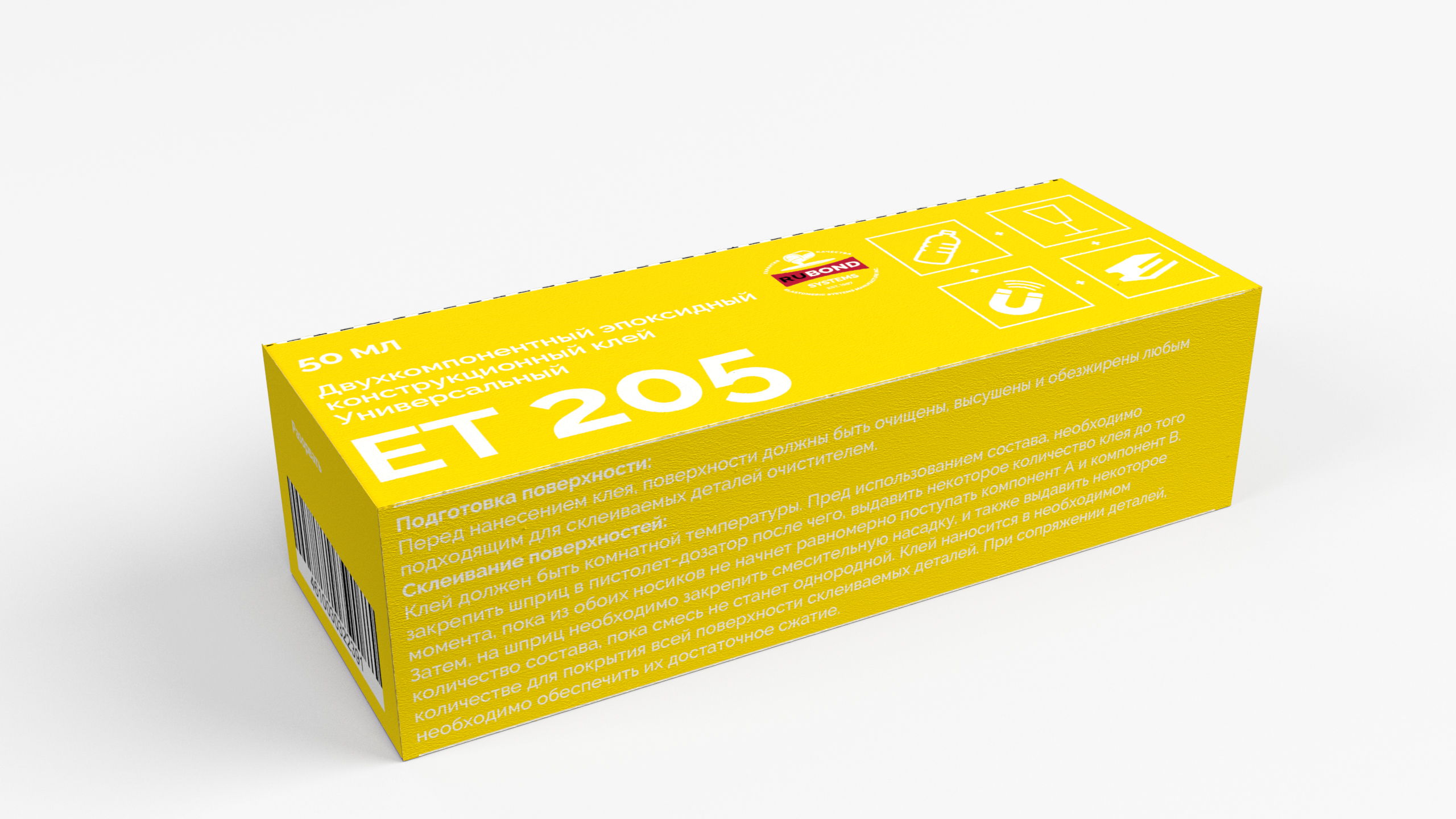 RuBond ET 205 – жёсткий универсальный эпоксидный клей, средней вязкости, хорошо растекается, способен заполнять и склеивать материалы с зазором до 5 мм. Состав обладает высокими прочностными характеристиками, предназначен для формирования клеевого соединения c начальной прочностью через 8-12 часов после нанесения. Продукт обладает отличными адгезионными свойствами и пригоден для склеивания различных материалов, таких как: чёрные и цветные металлы ферриты, керамика, стекло, композиты, бетон, искусственный камень, почти все пластики (за исключением полиолеэфинов, ПТФЭ и силиконов) с клеевым слоем до 5 мм, может использоваться в качестве заливочной композиции (компаунда). Клей идеально подходит для быстрого восстановления разрушенных поверхностей, плоскостей, элементов умеренно нагруженных деталей.