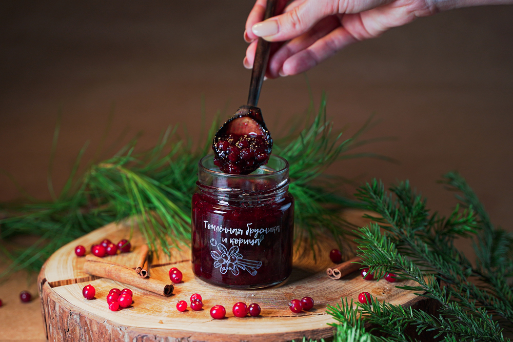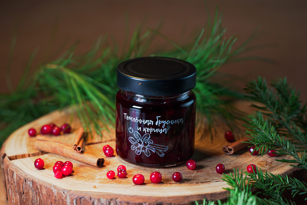 Джем - томленная лесная - дикорастущая брусника и корица, от компании Регион-К "Дары Югры". Место сбора дикоросов Ханты-Мансийский автономный округ - Югра. Состав: брусника лесная, пектин яблочный, корица, сахар.