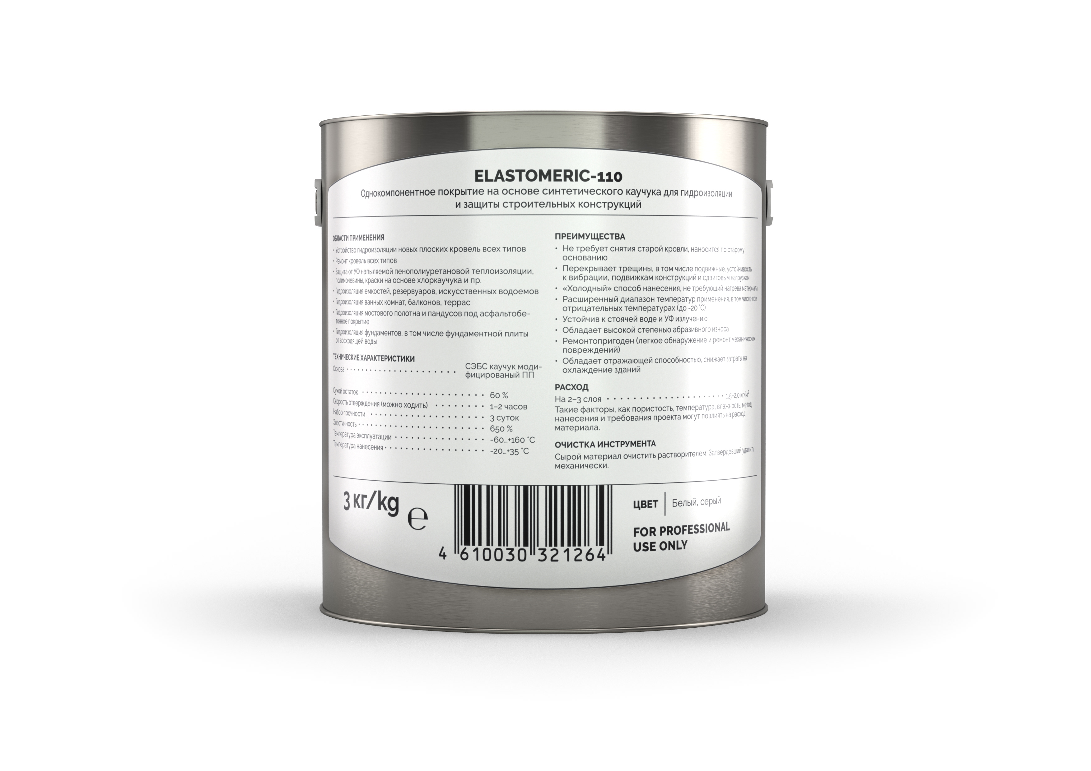 Однокомпонентное гидроизоляционное покрытие на основе блок сополимера синтетического каучука для гидроизоляции и защиты строительных конструкций и устройства долговечных бесшовных кровельных мембран. После высыхания образует упругую, водонепроницаемую, высокоэластичную мембрану, которая обладает очень высокой степенью абразивного износа, устойчивостью к воздействию ультрафиолета, растворов солей, кислот и щелочей. Содержит органический растворитель. После полного высыхания и полимеризации покрытие ELASTOMERIC - 110 экологически безопасно, так как не имеет в составе вулканизаторов, изоционатов и отвердителей.