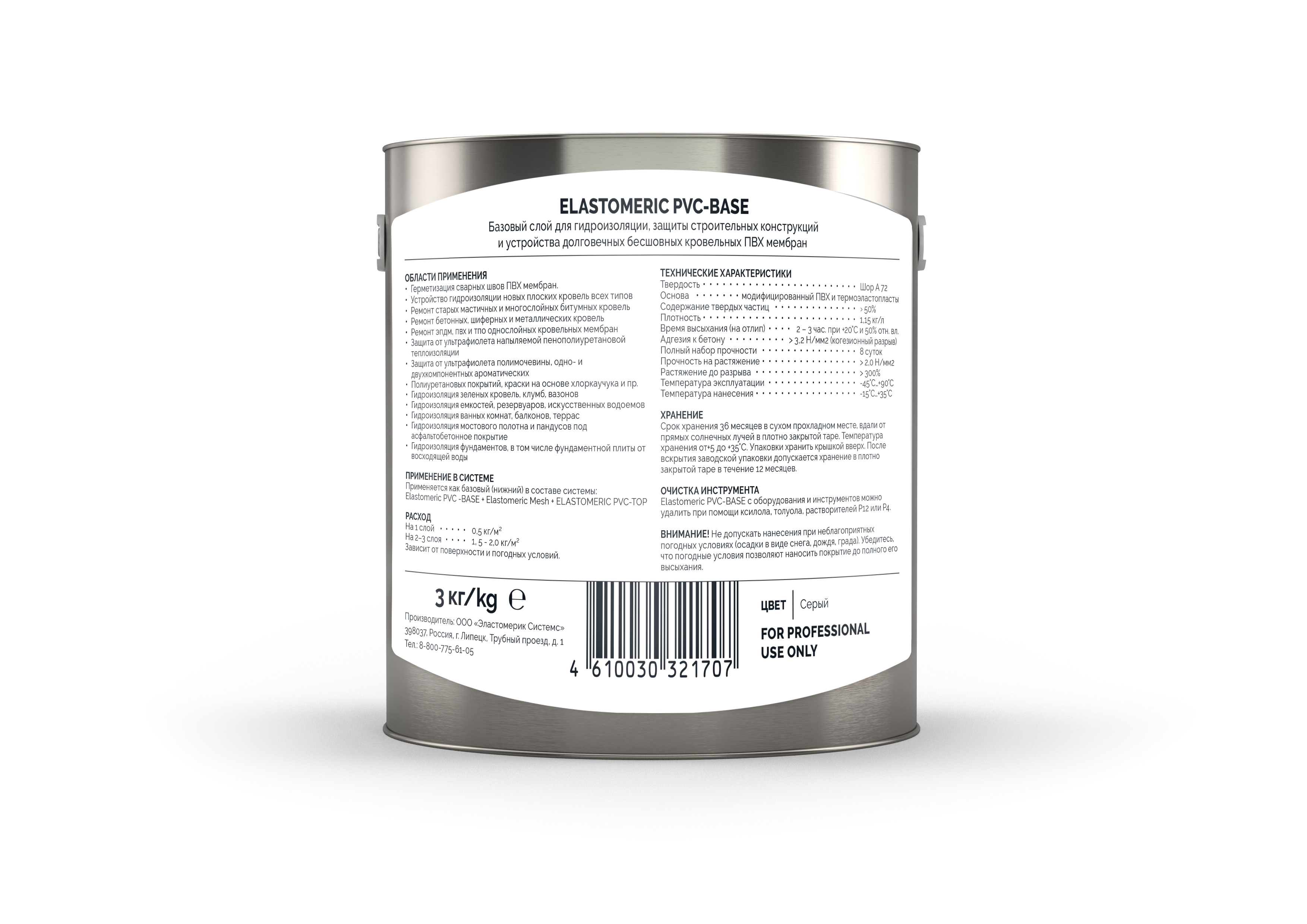 Жидкая ПВХ мембрана ELASTOMERIC PVС-Base – базовый слой наносимого в жидком виде однокомпонентного покрытия на основе модифицированного ПВХ, термоэластопластов и нефте-полимерных смол для гидроизоляции и защиты строительных конструкций и устройства долговечных бесшовных кровельных ПВХ мембран. Служит базовым подготовительным слоем, наносится через армирующее полиэфирное полотно Elastomeric Mesh. После высыхания образует упругую, водонепроницаемую, высокоэластичную ПВХ мембрану без сварных швов, по свойствам идентичную традиционным рулонным ПВХ мембранам. Обладает оченьвысокой степенью абразивного износа, умеренной устойчивостью к воздействию ультрафиолета, растворовсолей, кислот и щелочей. Содержит смесь органических растворителей. После полного высыхания иполимеризации покрытие ELASTOMERIC PVС-BASE экологически безопасно, так как не имеет в составевулканизаторов, изоционатов и отвердителей. Применяется как базовый (нижний) слой в составе системы: Elastomeric PVC-BASE + Elastomeric Mesh + ELASTOMERIC PVС-TOP.