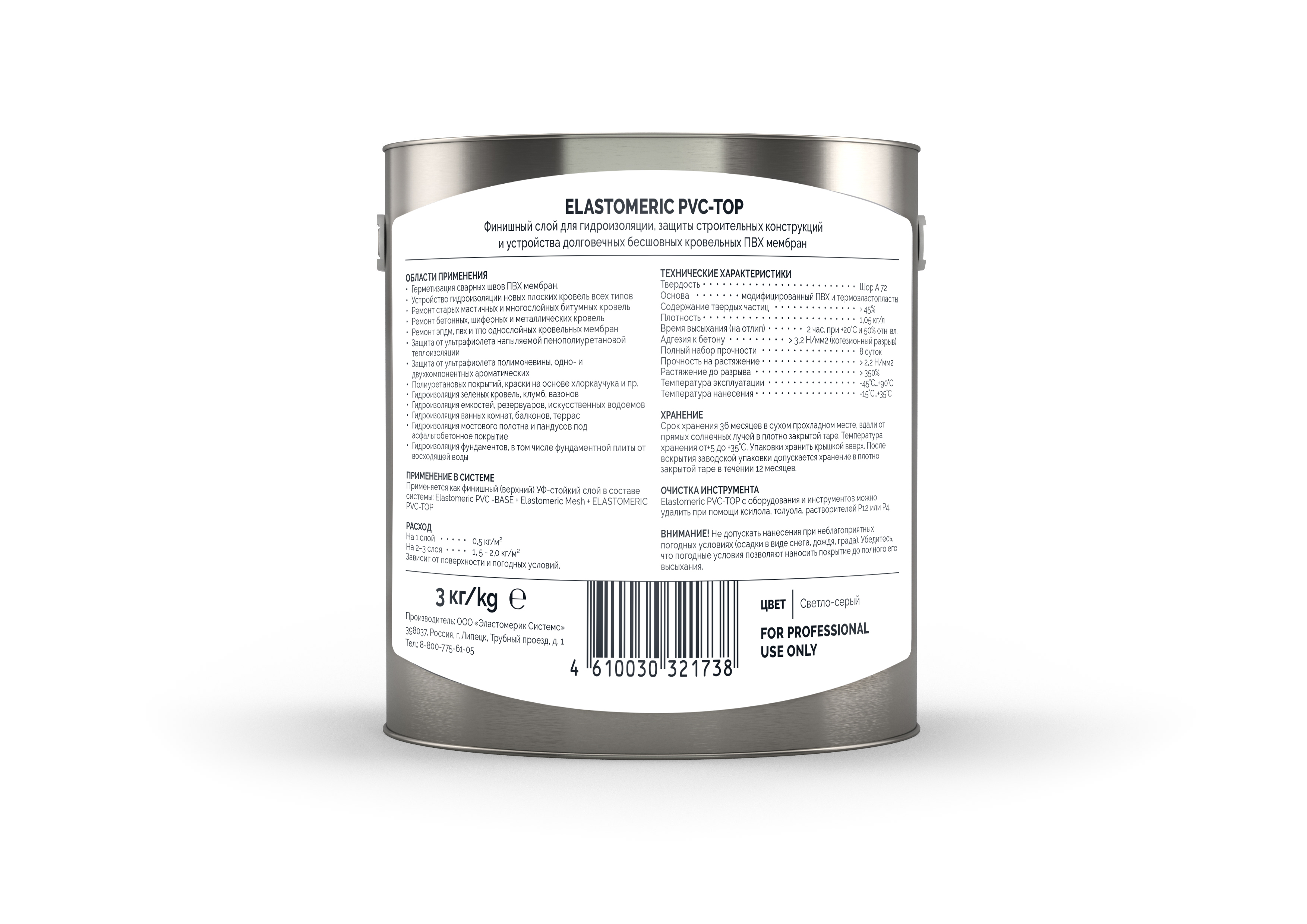 Жидкая ПВХ мембрана ELASTOMERIC PVС-TOP – верхний слой наносимого в жидком виде однокомпонентного покрытия на основе модифицированного ПВХ, термоэластопластов и нефте-полимерных смол для гидроизоляции и защиты строительных конструкций и устройства долговечных бесшовных кровельных ПВХ мембран. После высыхания образует упругую, водонепроницаемую, высокоэластичную ПВХ мембрану без сварных швов, по свойствам идентичную традиционным рулонным ПВХ мембранам. Обладает очень высокойстепенью абразивного износа, превосходной устойчивостью к воздействию ультрафиолета, растворов солей, кислот и щелочей. Содержит смесь органических растворителей. После полного высыхания и полимеризациипокрытие ELASTOMERIC PVС-TOP экологически безопасно, так как не имеет в составе вулканизаторов, изоционатов и отвердителей. Применяется как финишный (верхний) УФ-стойкий слой в составе системы: Elastomeric PVC-BASE + Elastomeric Mesh + ELASTOMERIC PVС-TOP.