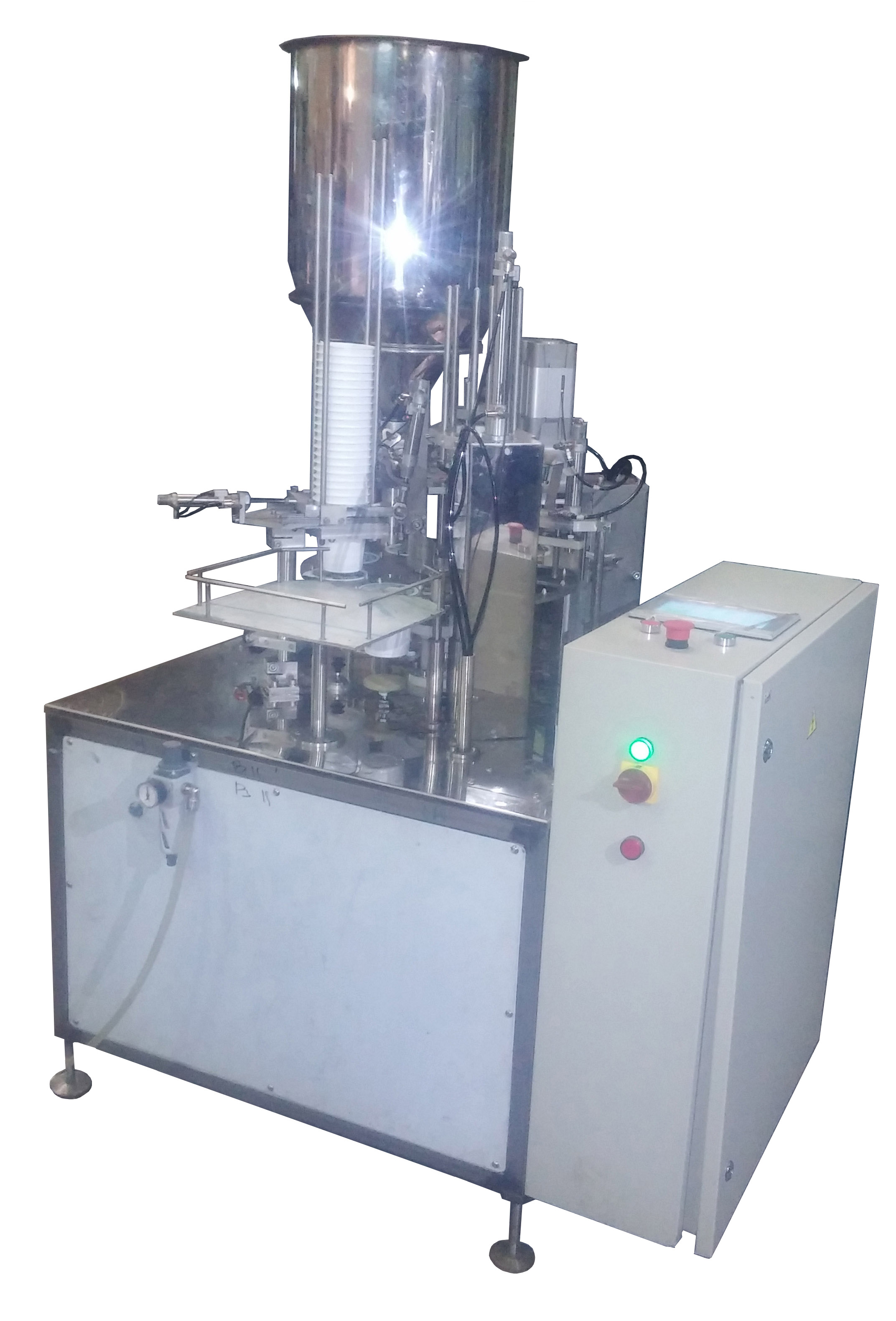 Автомат представляет собой малогабаритный комплекс роторного типа. Время переналадки сменного комплекта для стаканчиков разного диаметра – 30 мин.
