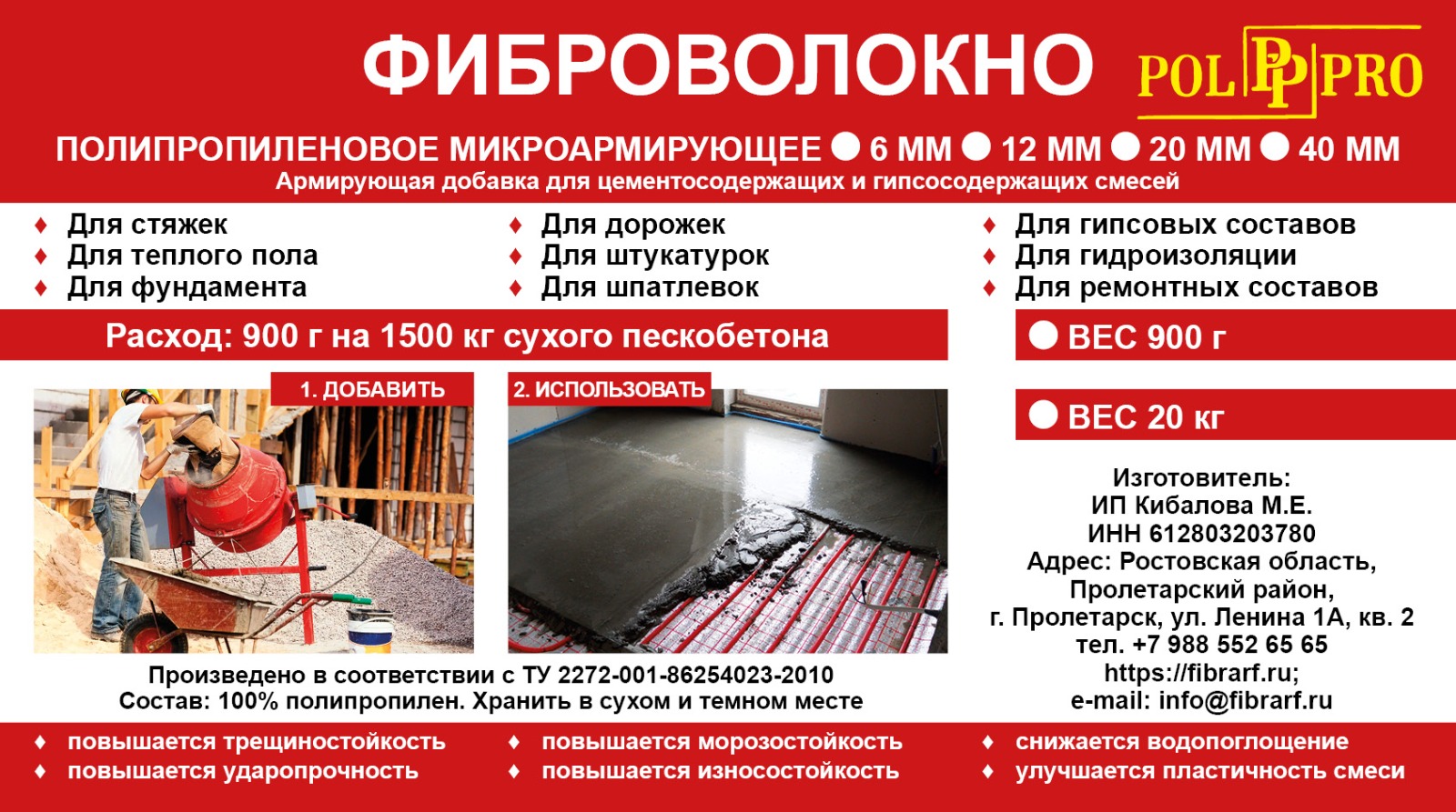 - Фиброволокно только высокого качества, с высокой армирующей способностью, изготовлено из 100% первичного полипропилена, толщина волокна 20 микрон