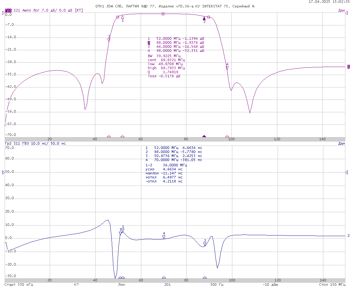 Фильтр LEFLFIF70.36I30Z75-HT0-001( микросборка v70.36.d12-a) предназначен для селекции сигналов в полосе 36 МГц с минимальной неравномерностью ГВЗ в полосе пропускания.