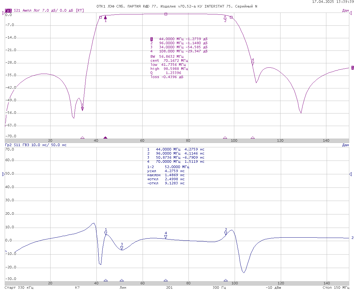 Фильтр LEFLFIF70BW52D07Z75-HT0-001( микросборка v70.52.d07-а) предназначен для селекции сигналов в полосе 52 МГц с минимальной неравномерностью ГВЗ в полосе пропускания.