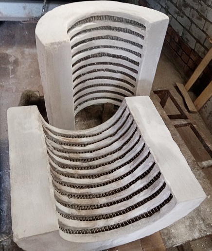 Решение задачи: создано готовое фасонное формованое огнеупорное изделие со спиралями нагрева (ТЭНами) - поэтапно изготовлено высокотемпературное изделие (изоляционный сегмент) по чертежу полусфера плотностью материала 450 кг/м3, произведен монтаж в полусферу спиралей из проволоки фехраль 11 рядов, проведено испытание на соответствие мощности и температуры нагрева до 1250 С, удостоверено состояние изделия в работоспособном состоянии без разрушений.