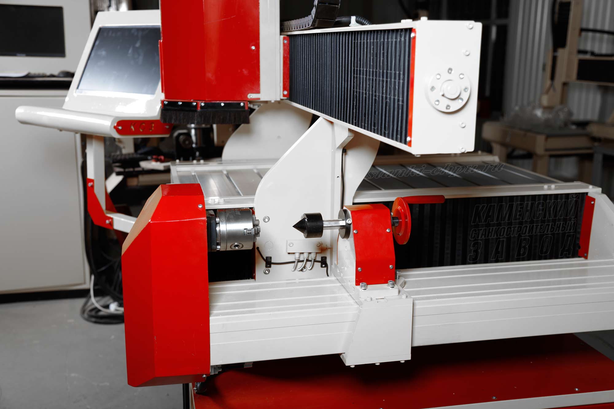 В базовой комплектации станка Super Router уже установлены рельсовые направляющие шириной 20 мм. Также он уже укомплектован стойкой управления, на которой удобно расположены монитор, клавиатура и мышь. Компьютер, управляющий станком расположен внутри стола-подставки. Кроме этого данный фрезерный станок имеет выносную четвертую (токарную) координату сбоку с токарным патроном. Это позволяет производить на станки также колонны для мебели, балясины для резных лестниц и другие изделия, требующие вращения в процессе обработки.