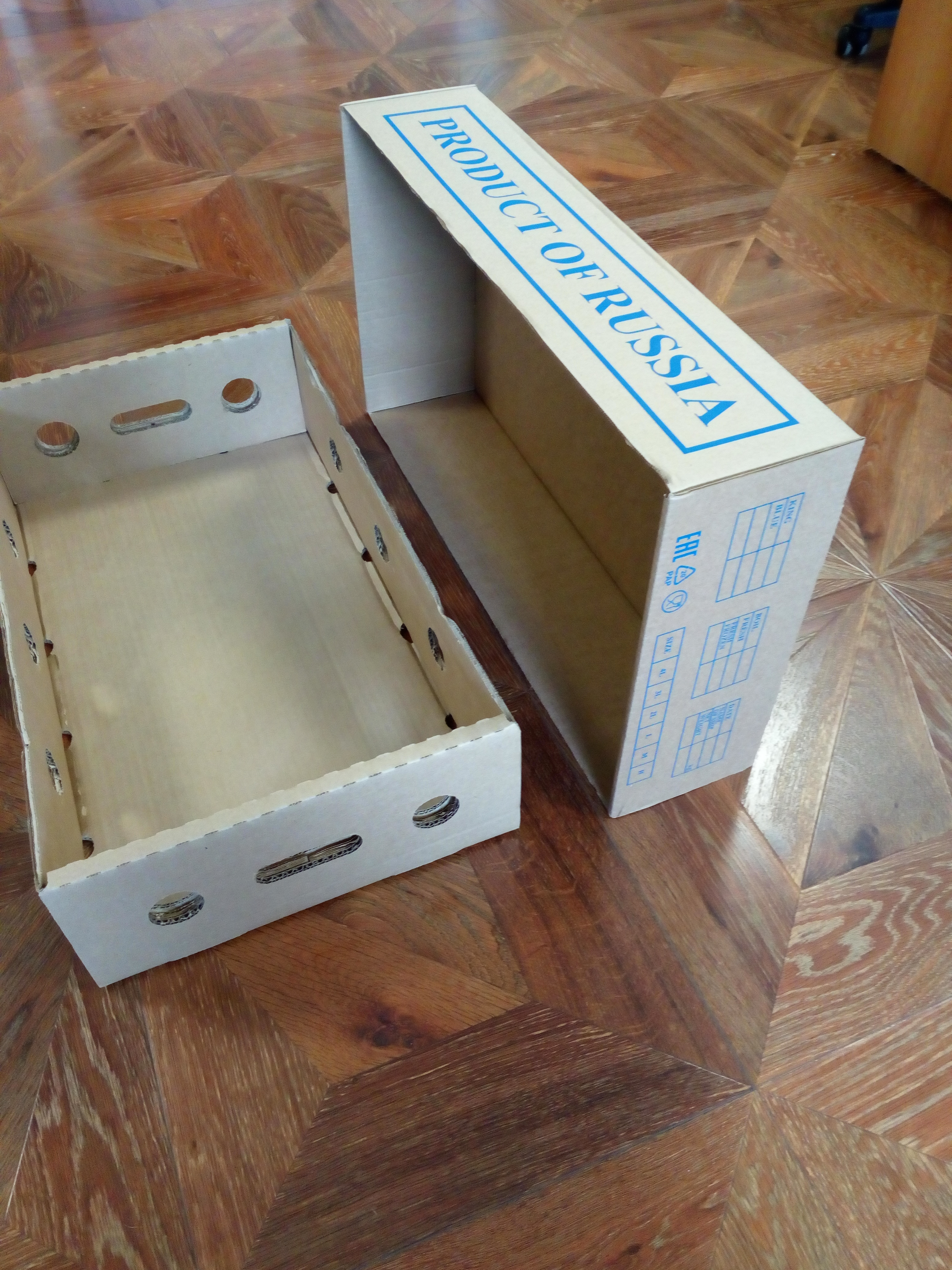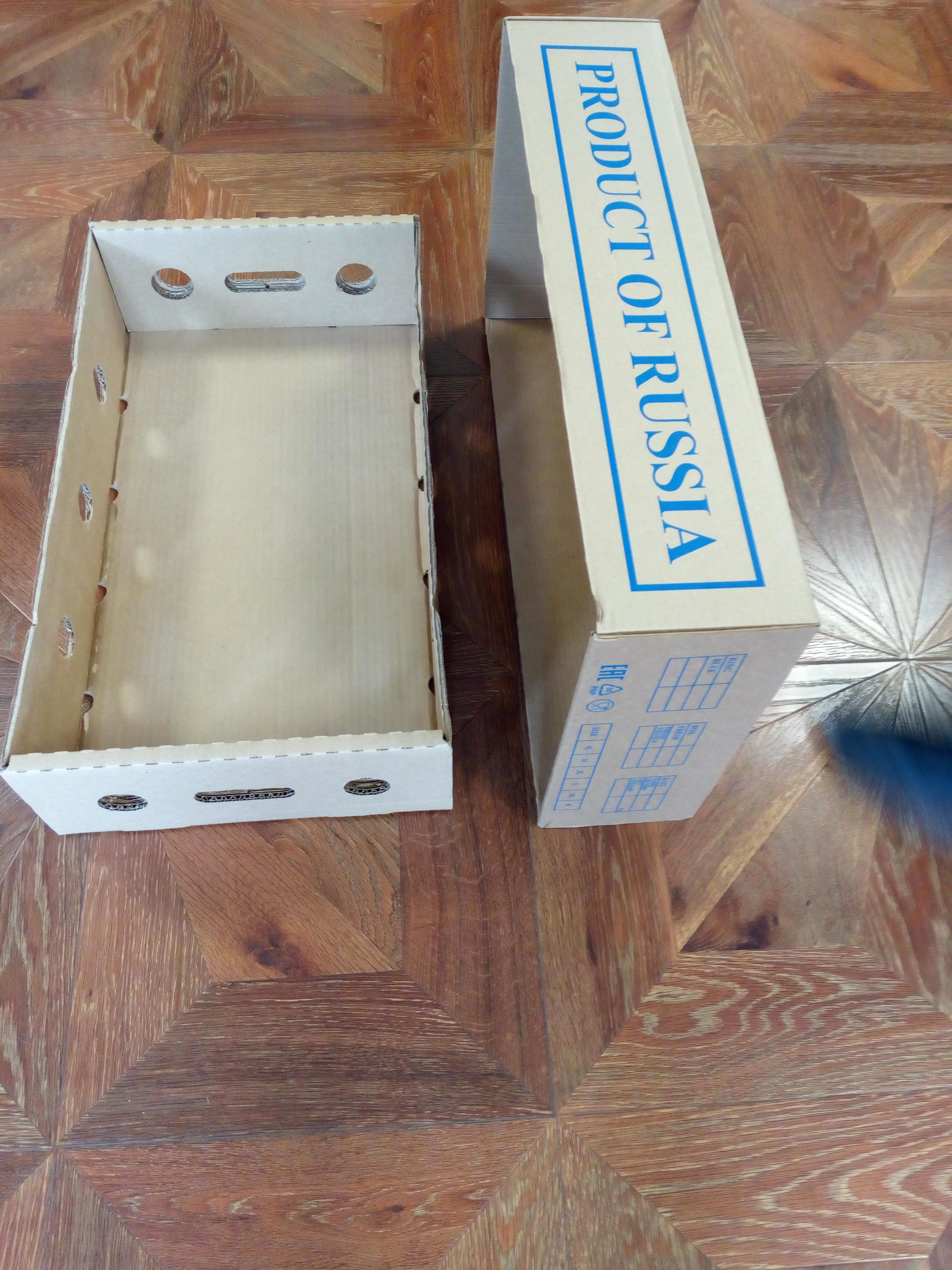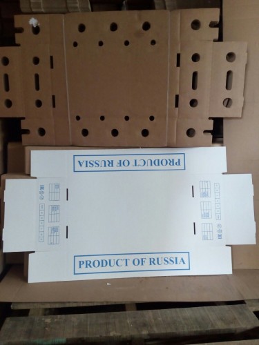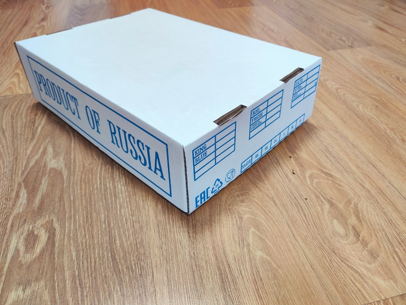 3. Г/Ящик №10 (645*362*145мм.), Двухкомпонентный, белый цвет, синий трафарет PRODUCT OF RUSSIA и знаки МЗУ,