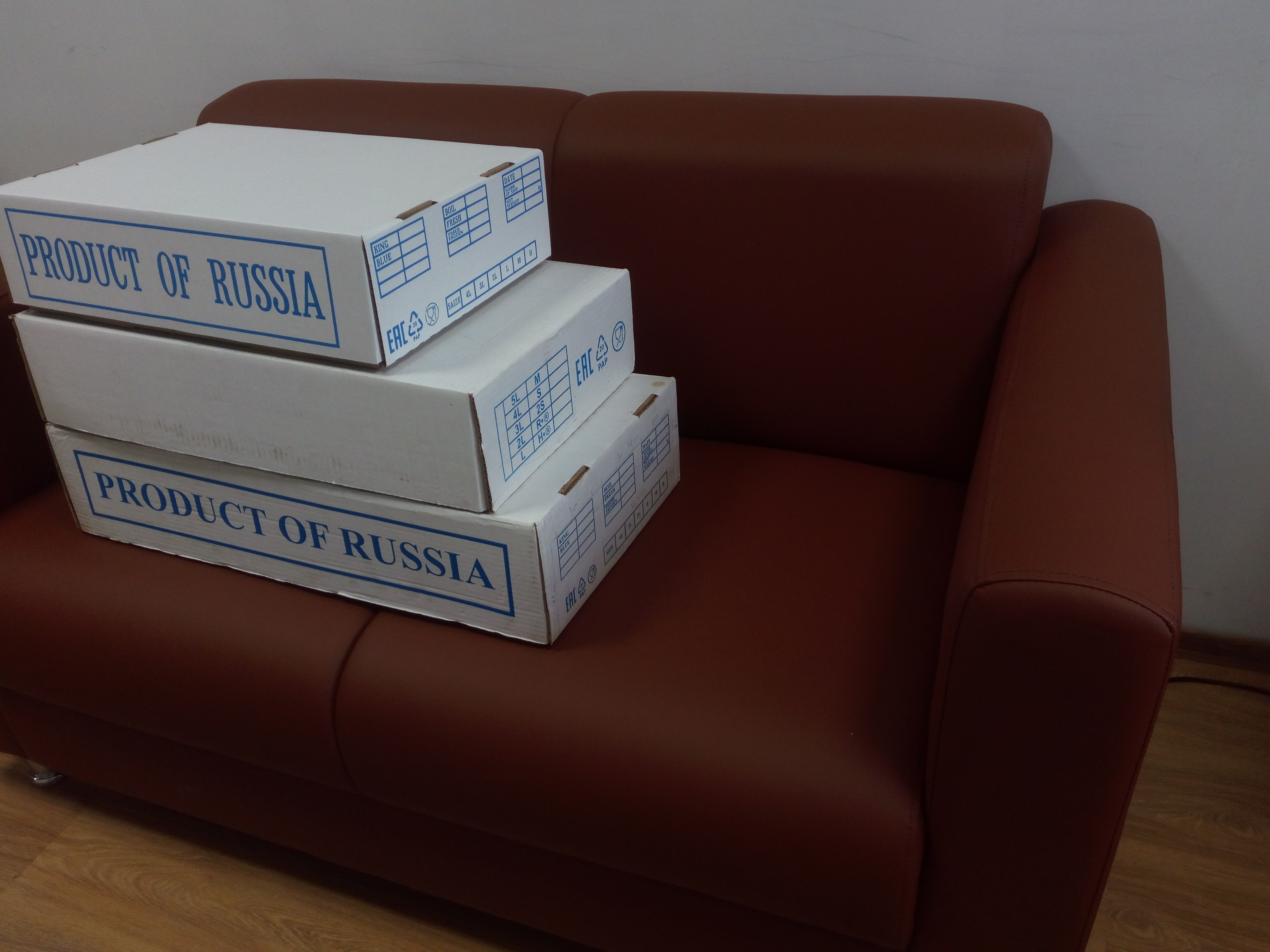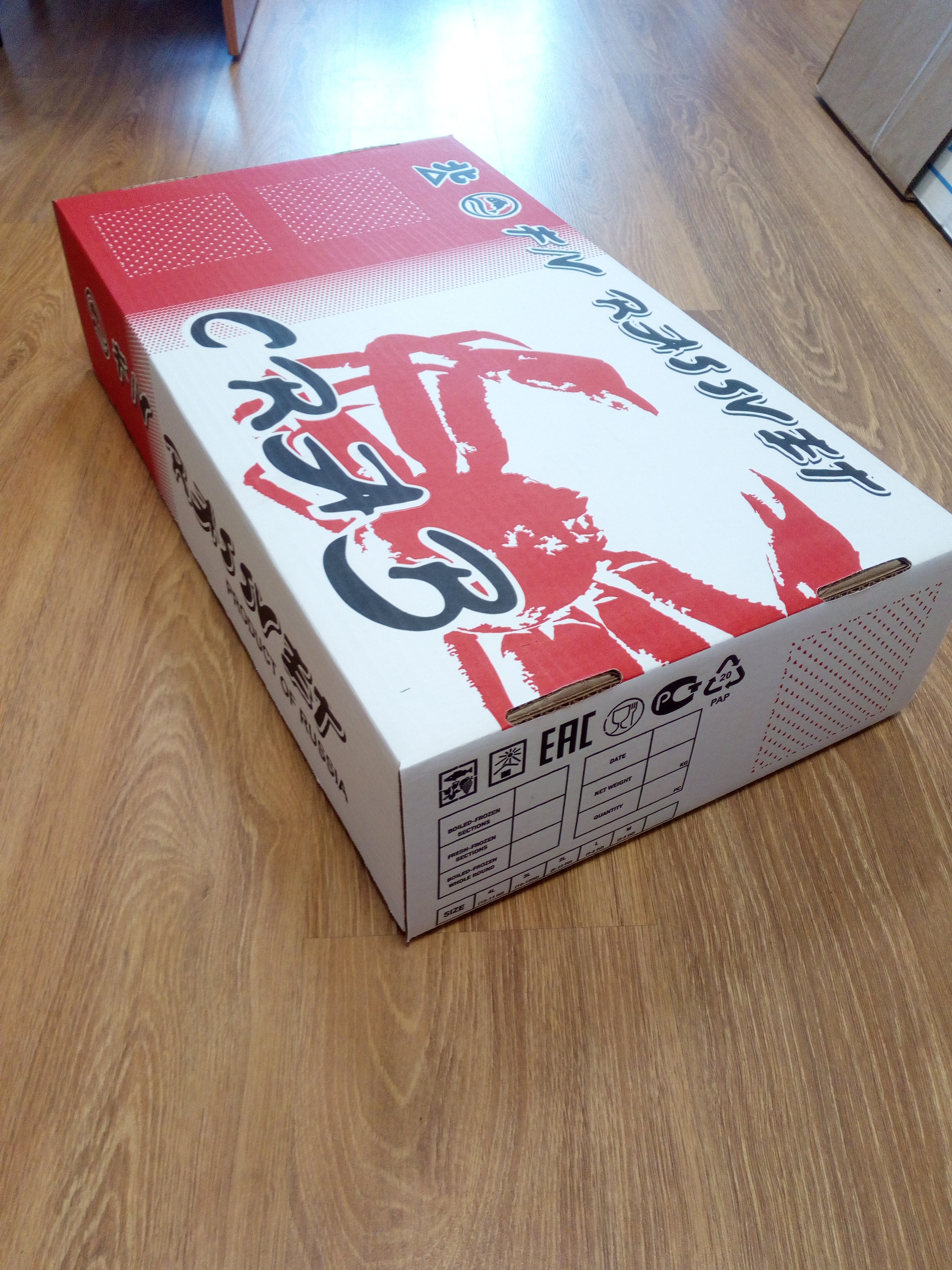 1. Г/Ящик крабовый №5, (480*335*120мм.), двухкомпонентный, белый цвет с синим трафаретом PRODUCT OF RUSSIA и знаками МЗУ,
