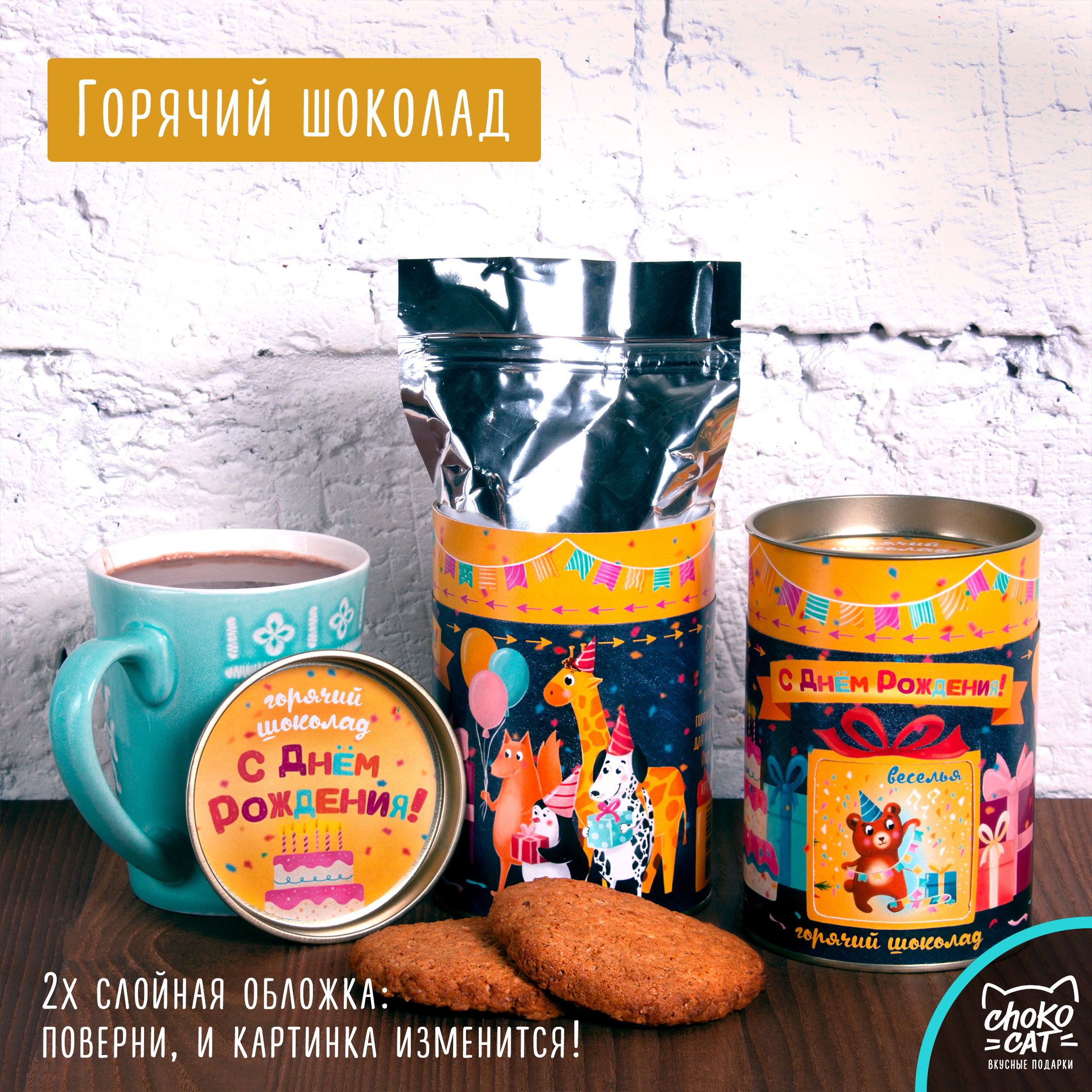 Сочетание ярких иллюстраций, горячего шоколада и интерактивной упаковки гарантировано привлечёт внимание покупателя! ИГРА: поворачивай этикетку и читай весёлые поздравления и пожелания. КАЧЕСТВО: вкуснейший горячий шоколад дополнительно запакован в герметичный фольгированный пакет, чтобы сохранить его свежесть.