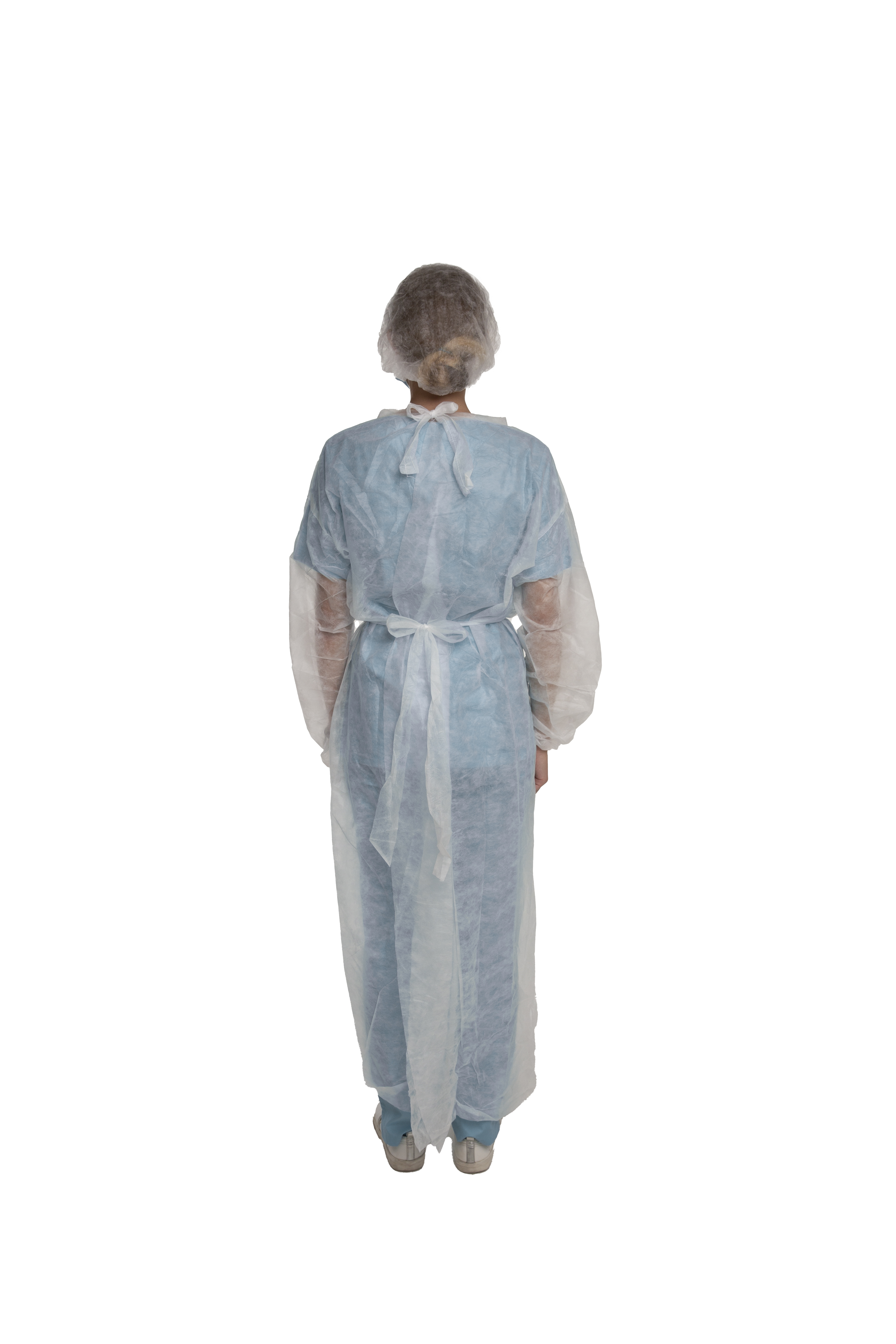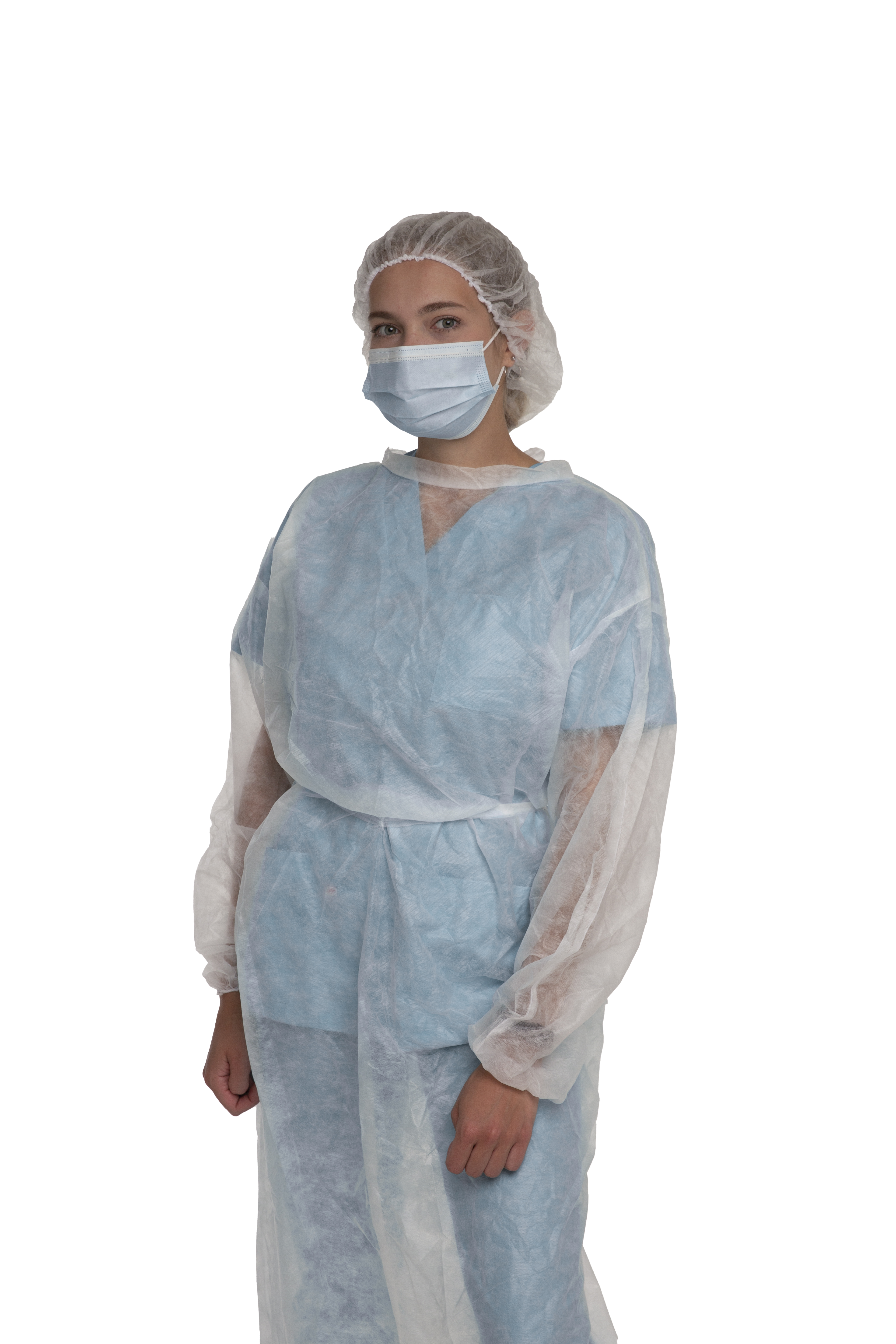 Халат одноразовый на завязках из материала спанбонд плотностью 20 г/м2. Рукава на резинке. длина халата: 140 см.