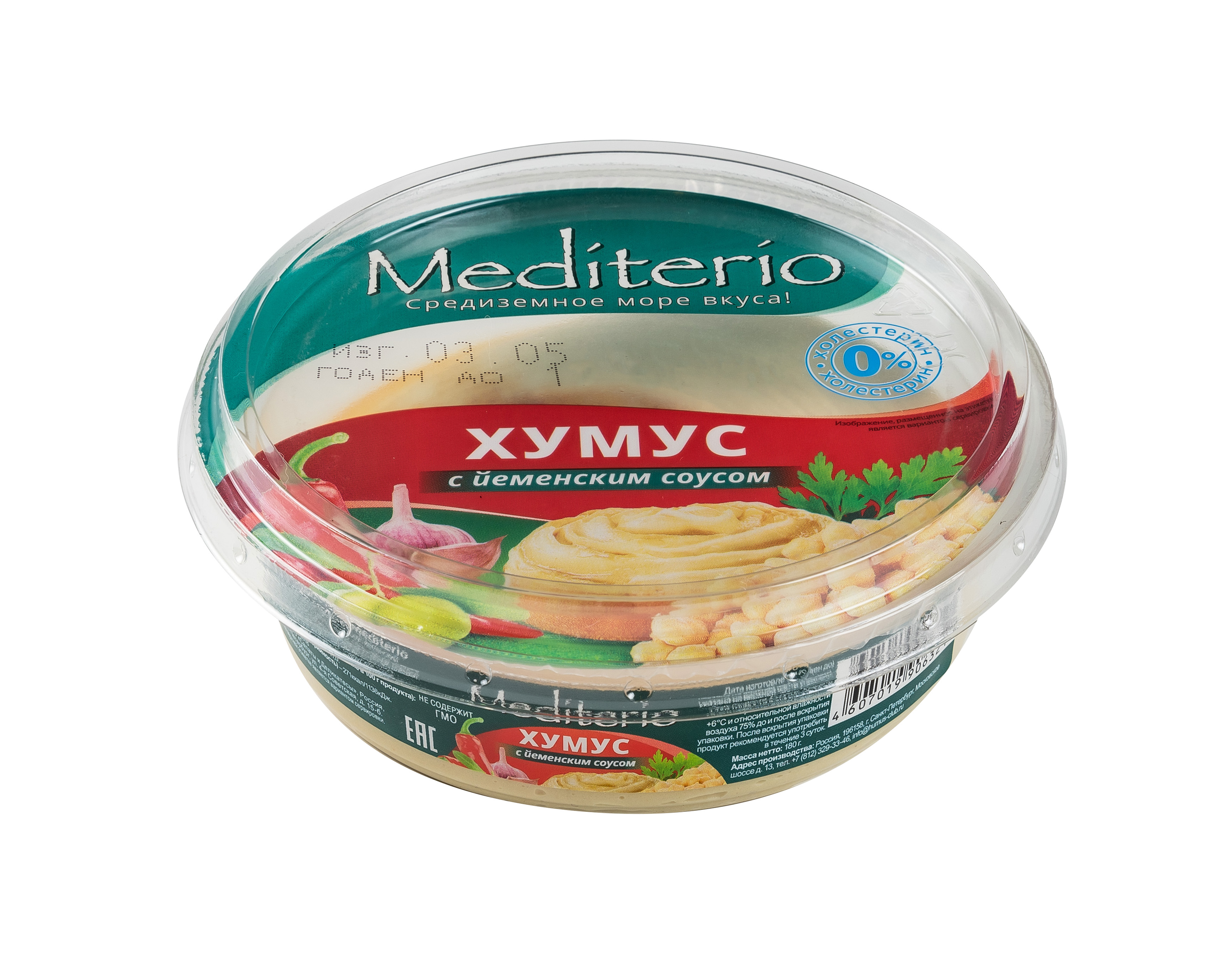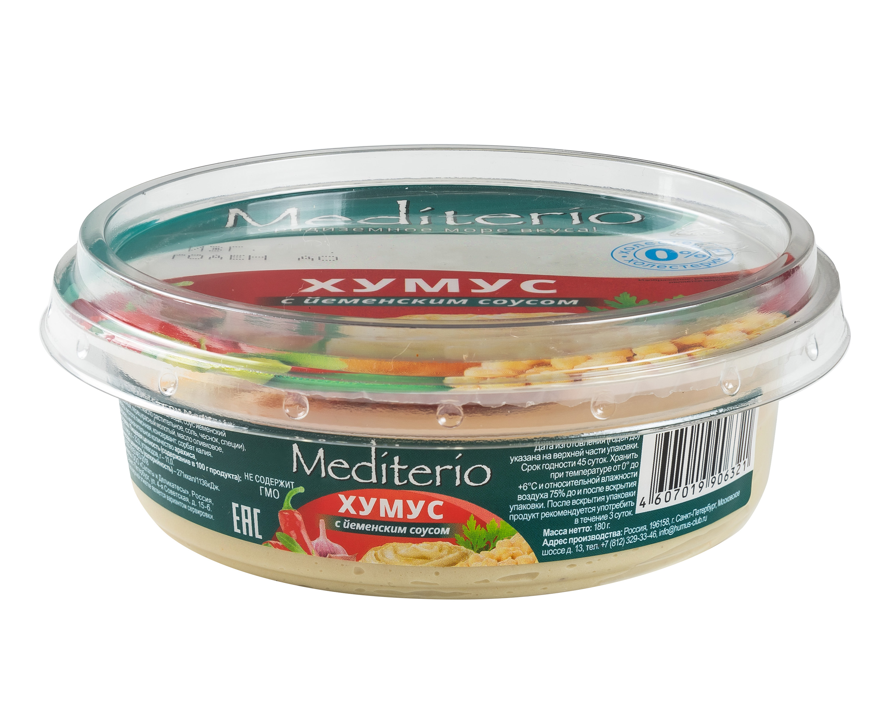 Хумус с йеменским соусом придётся по вкусу тем, кто любит острые блюда. Хумус Mediterio с добавлением данного соуса имеет довольно изысканный вкус, который достигается за счёт уникального сочетания хумуса и разного вида перцев и специй. Осторожно, это очень остро! И очень вкусно!