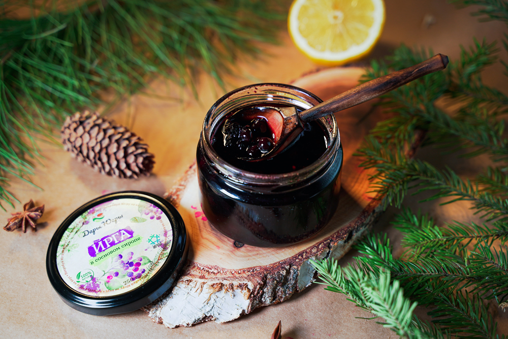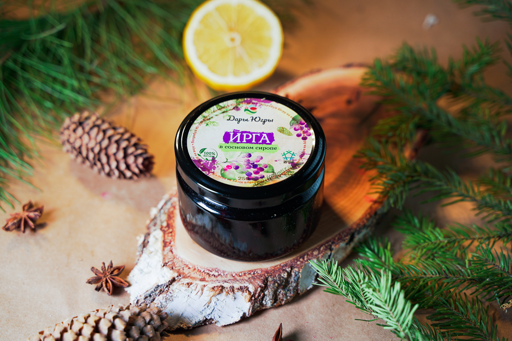 Ирга лесная - дикорастущая, в сосновом сиропе из молодых сосновых шишек, от компании Регион-К "Дары Югры". Место сбора дикоросов Ханты-Мансийский автономный округ - Югра. Состав: сосновый сироп (молодая шишка сосны, сахар, вода), ирга лесная.