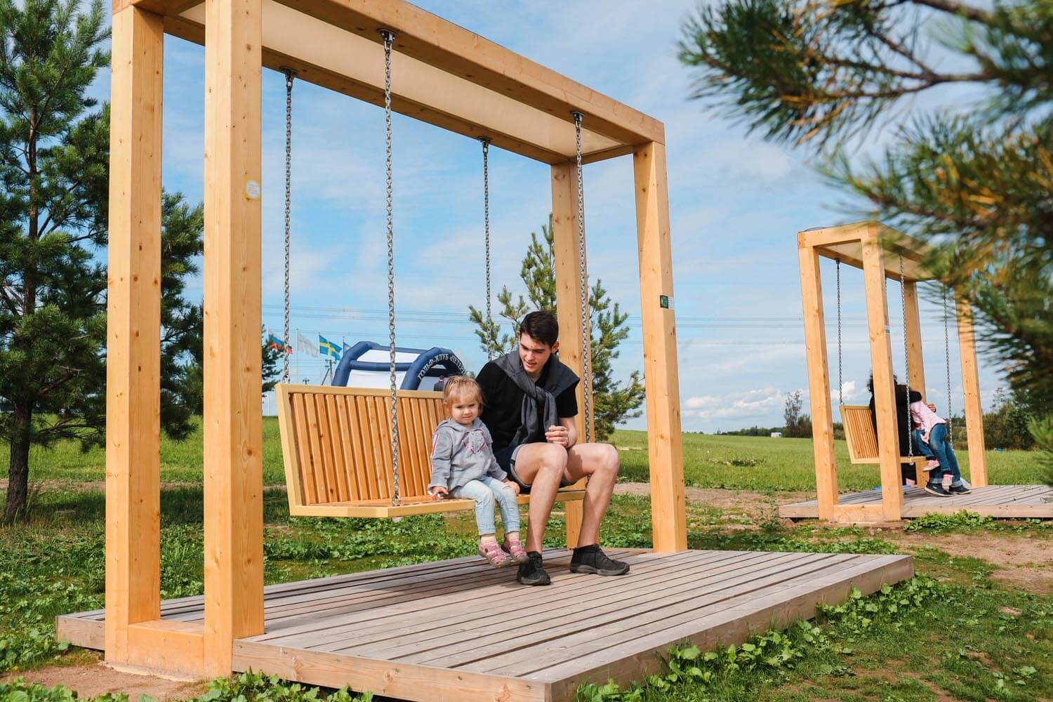 При создании качелей серии «WOOD» учитывался физиологический и психологический комфорт и детей, и взрослых – принималось в расчет расстояние до земли, наклон спинки, амплитуда раскачивания.