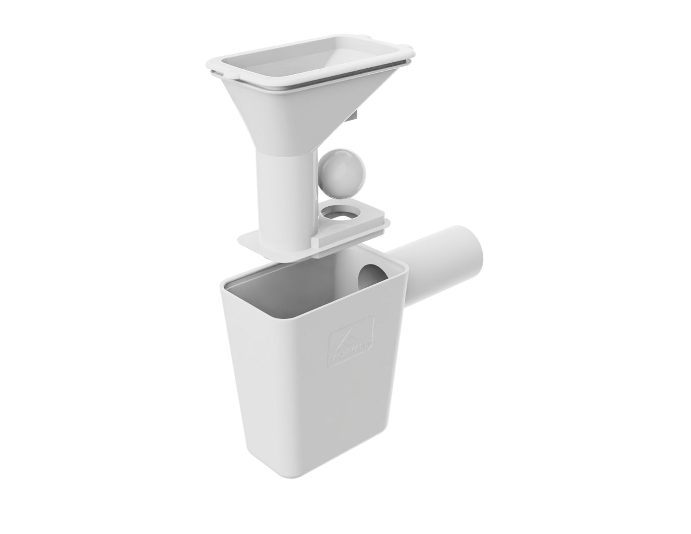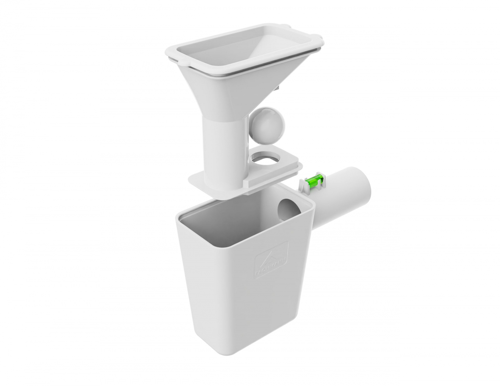 Воронка оснащена гидрозатвором и дополнительным механическим запахозапирающим устройством. Его роль выполняет шарик, который при пересыхании гидрозатвора опускается (садится) в выходной патрубок и не пропускает канализационные испарения в помещение.