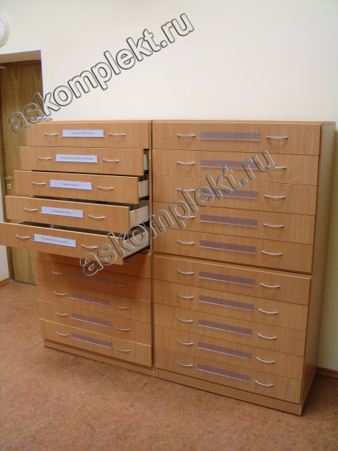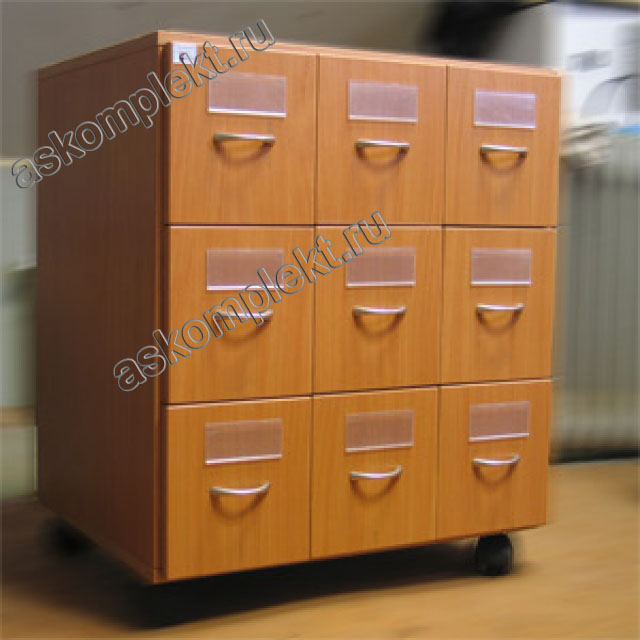 Стандартный состав каталожного шкафа – опорные ножки или тумба –основание, 1- 2 мудуля каталожного шкафа на 8, 10, 16, 20 ящиков, выдвижной стол.