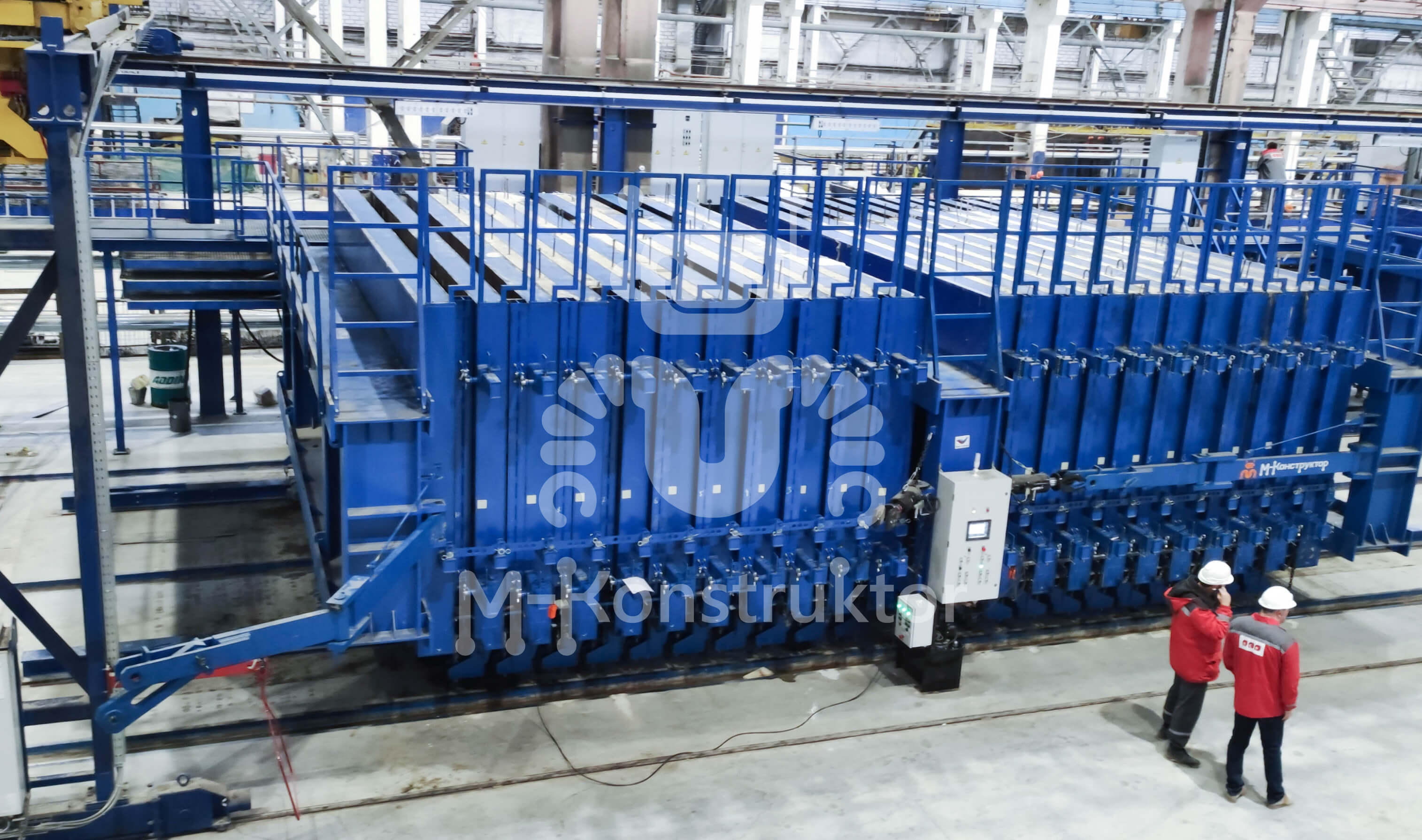 Для деления длины секции пополам и изготовлении двух панелей на одной поверхности предусмотрен разделительный борт. В совокупности с применением проемообразователей это дает возможность выпуска стеновых панелей домов различных серий. Уплотняют бетон мощные высокочастотные вибраторы.