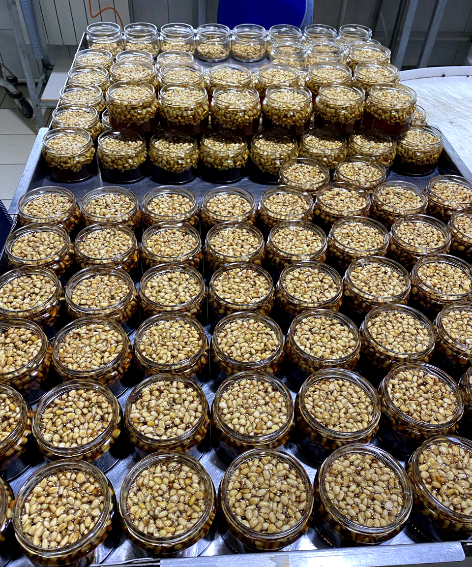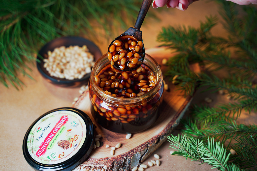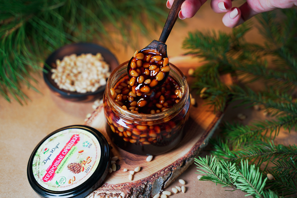 Кедровые орешки в сосновом сиропе из молодых сосновых шишек, от компании Регион-К "Дары Югры". Место сбора дикоросов Ханты-Мансийский автономный округ - Югра. Состав: ядро кедрового ореха, сироп из молодых сосновых шишек.