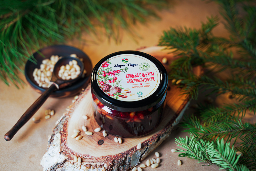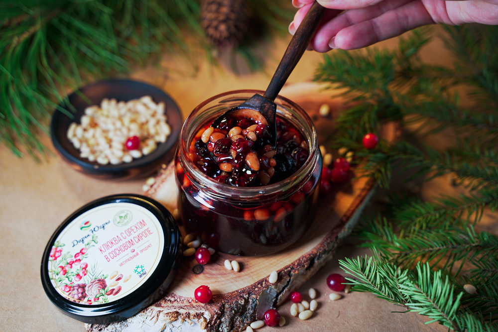 Клюква вяленая с ядром кедрового ореха в сиропе из молодых сосновых шишек, от компании Регион-К "Дары Югры". Место сбора дикоросов Ханты-Мансийский автономный округ - Югра. Состав: клюква лесная вяленая, ядро кедрового ореха, сосновый сироп: молодая шишка сосны, вода, сахар.