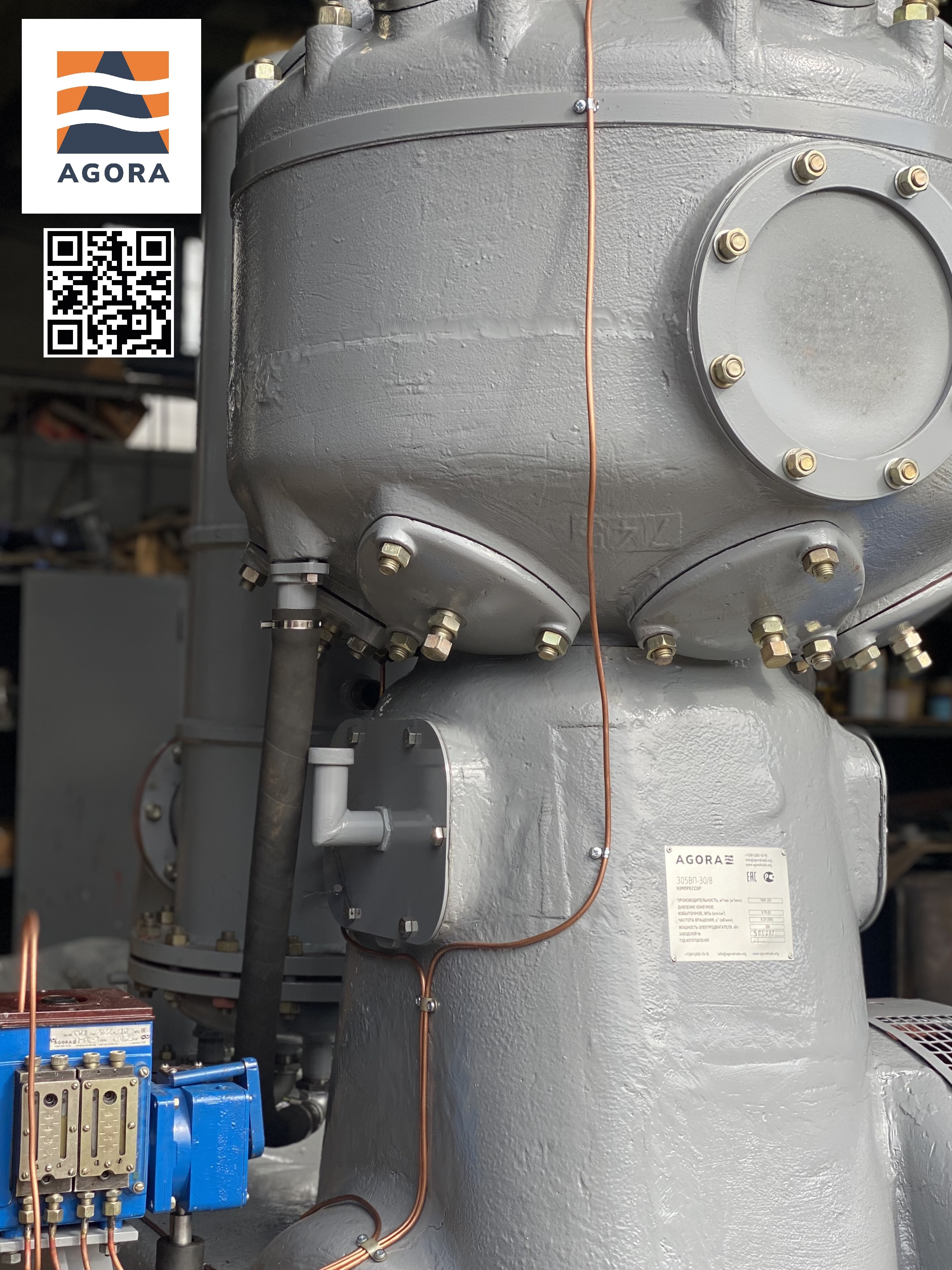 Компрессор стационарный, поршневой, крейцкопфный, двухступенчатый, угловой, с водяным охлаждением, со смазкой цилиндров и сальников. Компрессор данного типа предназначен для сжатия агента до давления 8 кгс/см2. Привод осуществляется от односкоростного синхронного электродвигателя типа БСДКМ15-21-12У3, встроенного в раму компрессора, также может комплектоваться асинхронным двигателем. Компрессор имеет защиту и сигнализацию по основным рабочим параметрам.