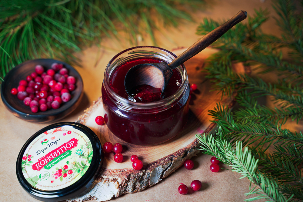 Конфитюр брусничный из лесной - дикорастущей брусники от компании Регион-К "Дары Югры". Место сбора дикоросов Ханты-Мансийский автономный округ - Югра. Состав: брусника лесная, пектин яблочный.