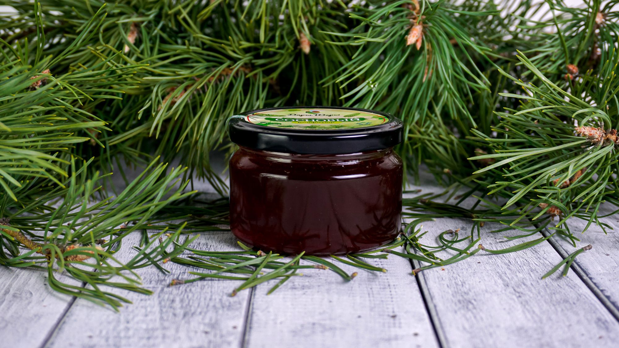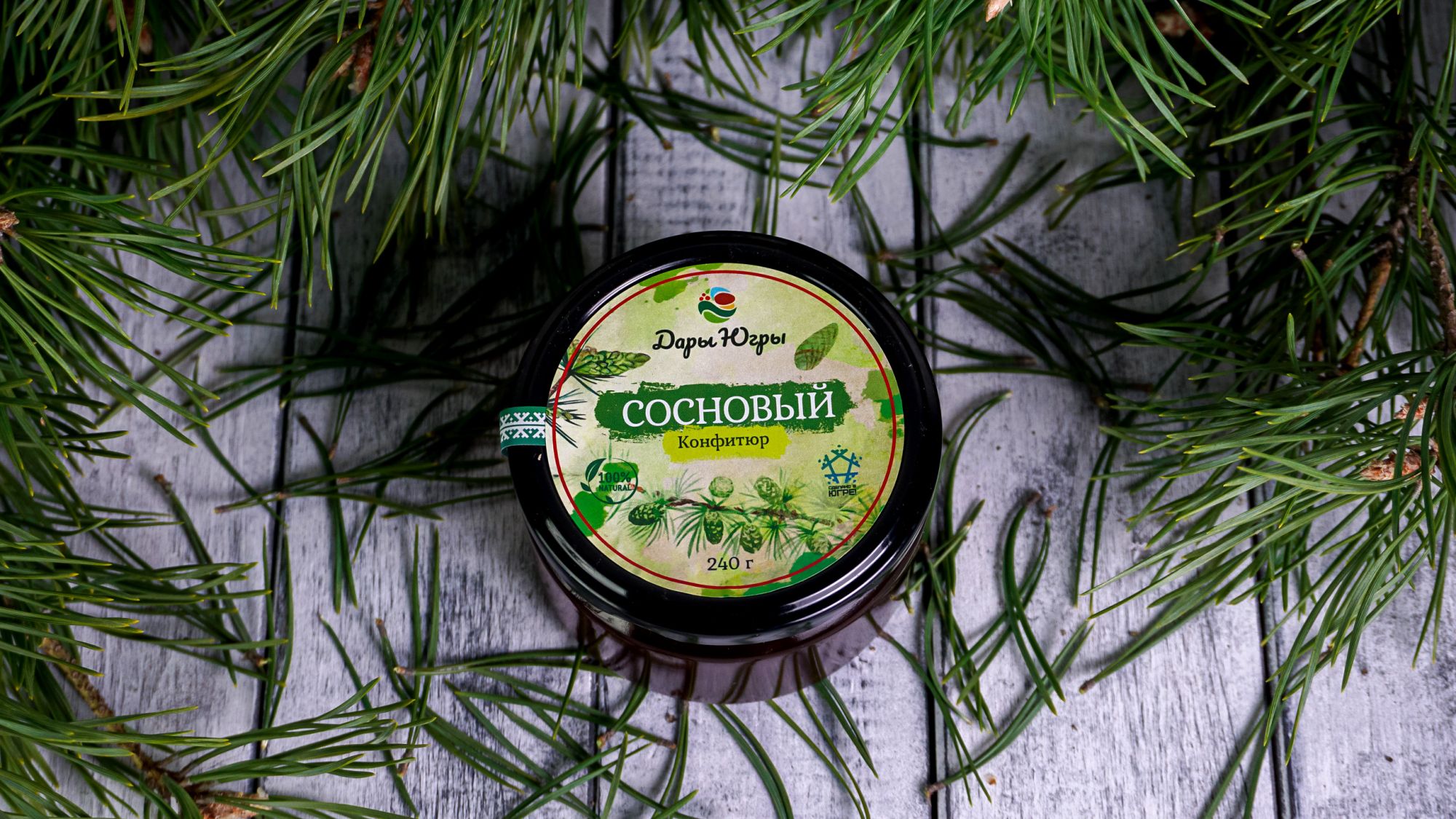 Конфитюр сосновый из молодых сосновых шишек от компании Регион-К "Дары Югры". Место сбора дикоросов Ханты-Мансийский автономный округ - Югра. Состав: сироп из сосновых шишек (молодая шишка сосны, сахар, вода), пектин яблочный.