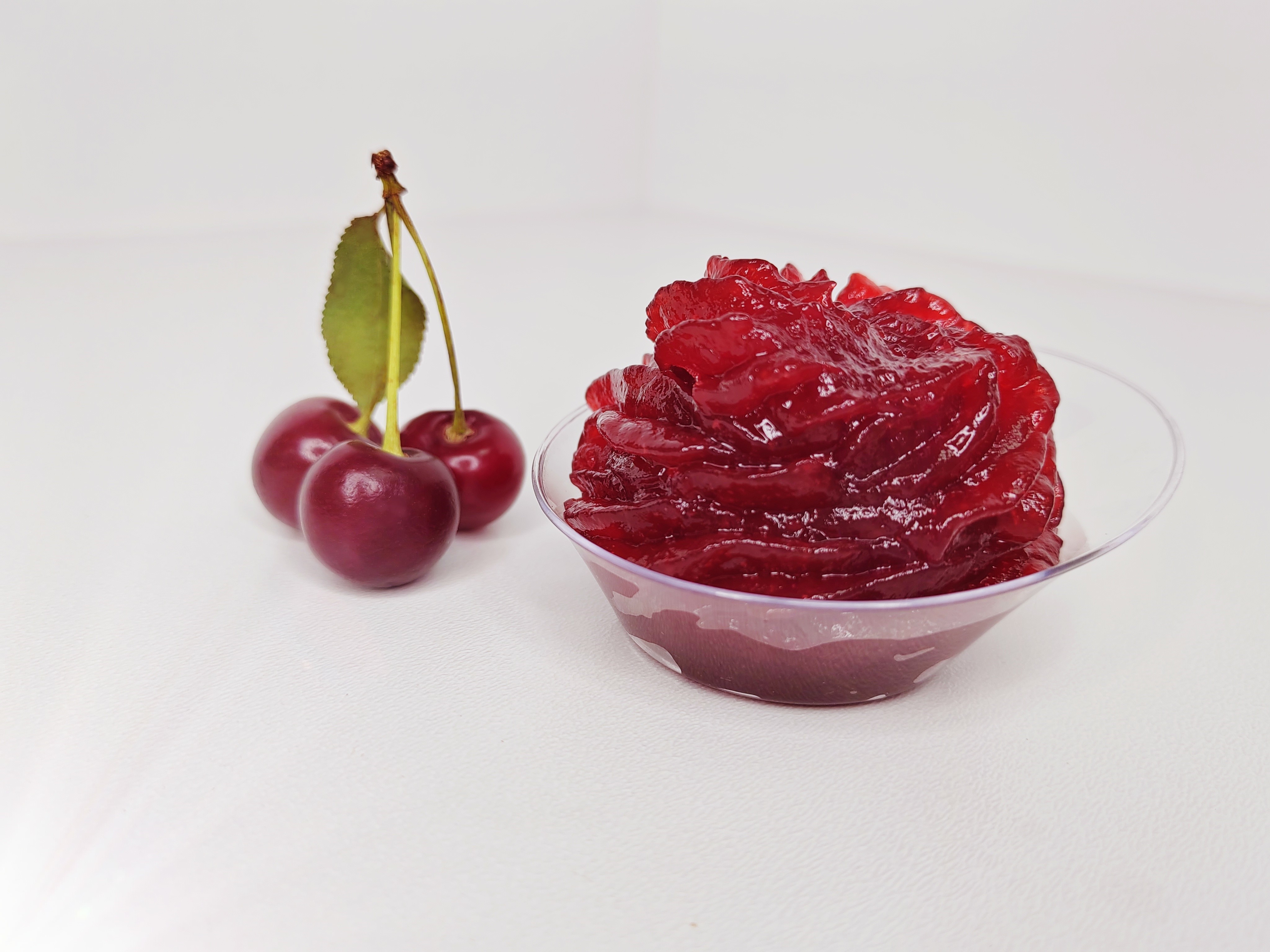 Конфитюр красного цвета, сладкий, с ярко выраженным вкусом и ароматом вишни. Представляет собой желированную массу целых плодов или их крупных фрагментов. Фруктовая часть - кусочки ягод не менее 50%.